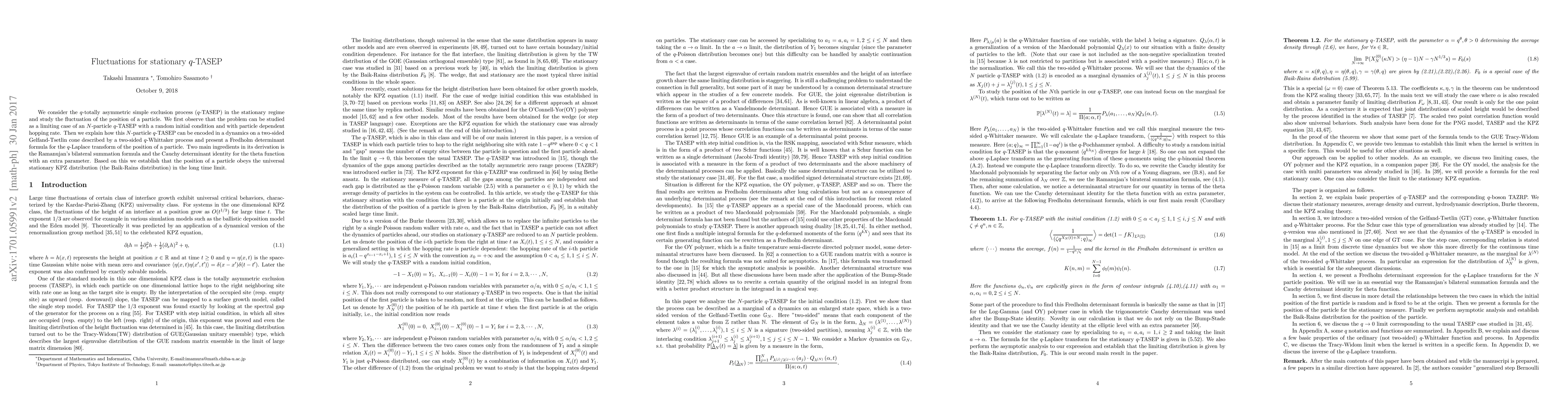 We consider the $q$-totally asymmetric simple exclusion process ($q$-TASEP) in the stationary regime and study the fluctuation of the position of a particle. We first observe that the problem can be studied as a limiting case of an $N$-particle $q$-TASEP with a random initial condition and with particle dependent hopping rate. Then we explain how this $N$-particle $q$-TASEP can be encoded in a dynamics on a two-sided Gelfand-Tsetlin cone described by a two-sided $q$-Whittaker process and present a Fredholm determinant formula for the $q$-Laplace transform of the position of a particle. Two main ingredients in its derivation is the Ramanujan's bilateral summation formula and the Cauchy determinant identity for the theta function with an extra parameter. Based on this we establish that the position of a particle obeys the universal stationary KPZ distribution (the Baik-Rains distribution) in the long time limit.