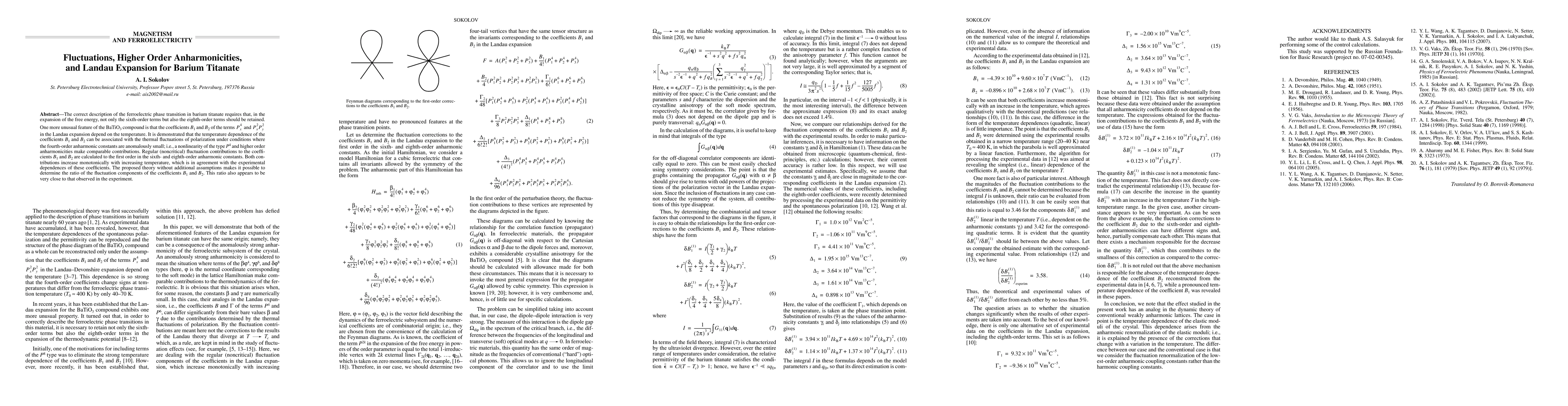 The research examines barium titanate, finding that its ferroelectric phase transition requires eighth-order terms in free energy expansion, alongside sixth-order contributions. It explains that temperature-dependent coefficients B_1 and B_2 in Landau expansion result from thermal fluctuations of polarization, with non-singular fluctuation contributions calculated for both sixth- and eighth-order anharmonic constants. The theory accurately estimates the ratio of fluctuation contributions to coefficients B_1 and B_2, aligning with experimental values.