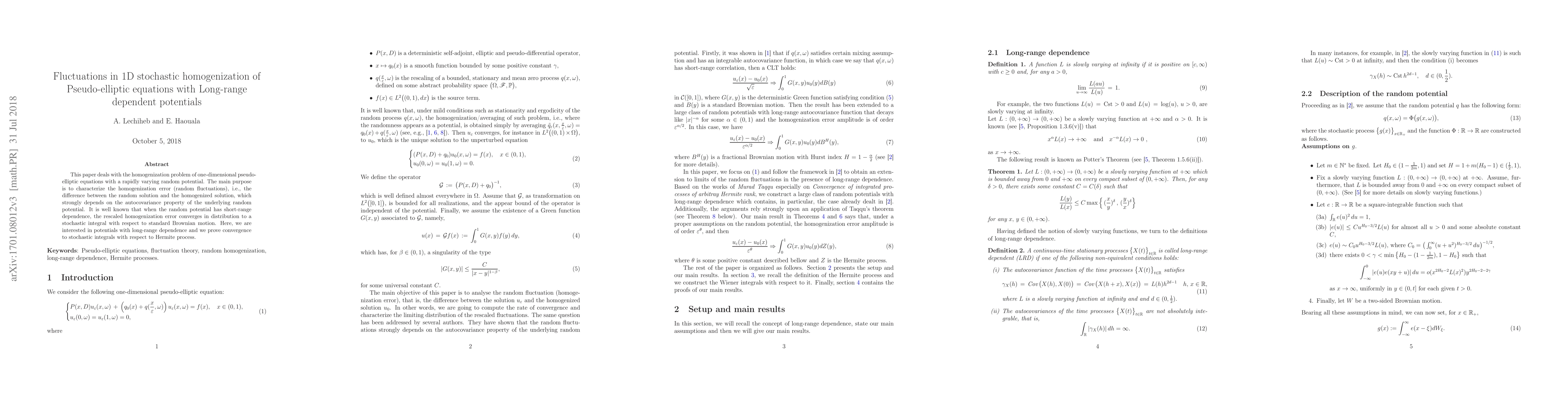 This paper deals with the homogenization problem of one-dimensional pseudo-elliptic equations with a rapidly varying random potential. The main purpose is to characterize the homogenization error (random fluctuations), i.e., the difference between the random solution and the homogenized solution, which strongly depends on the autocovariance property of the underlying random potential. It is well known that when the random potential has short-range dependence, the rescaled homogenization error converges in distribution to a stochastic integral with respect to standard Brownian motion. Here, we are interested in potentials with long-range dependence and we prove convergence to stochastic integrals with respect to Hermite process.
