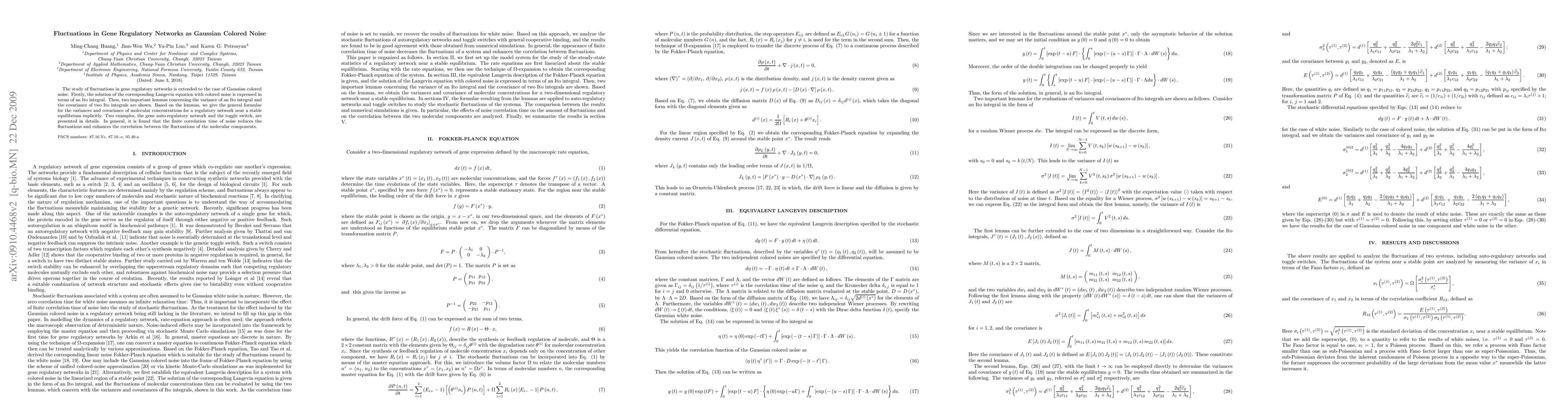 This paper investigates fluctuations in gene regulatory networks under Gaussian colored noise, deriving solutions for the Langevin equation using Ito integrals. It provides explicit formulae for variances and covariances of molecular concentrations near equilibrium, revealing that finite correlation time of noise reduces fluctuations and enhances correlation among molecular components.