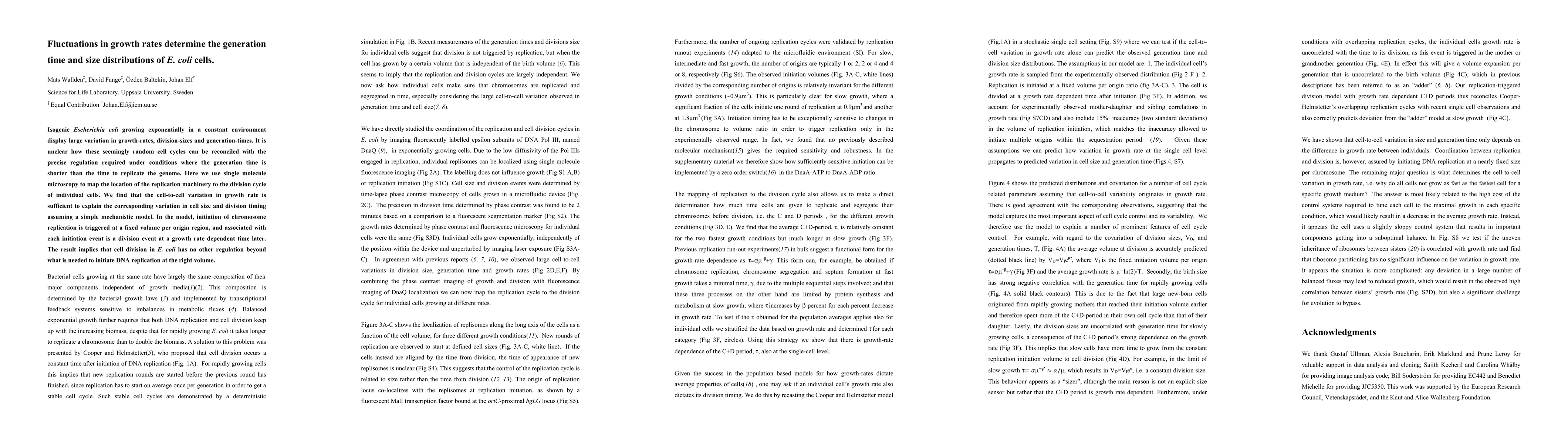 This paper investigates the variability in growth rates, division sizes, and generation times of E. coli cells in a constant environment, revealing that fluctuations in growth rates alone can explain the observed variations in cell size and division timing through a simple mechanistic model. The model suggests that chromosome replication initiation is triggered at a fixed volume per origin region, with division occurring at a growth rate dependent time later.