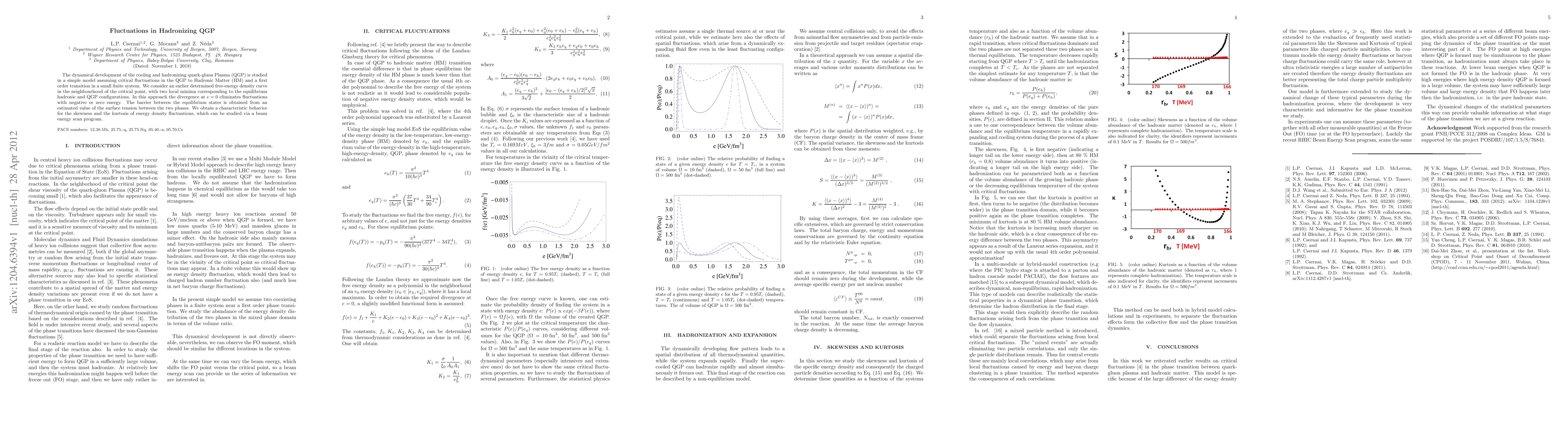 The dynamical development of the cooling and hadronizing quark-gluon Plasma (QGP) is studied in a simple model assuming critical fluctuations in the QGP to Hadronic Matter (HM) and a first order transition in a small finite system. We consider an earlier determined free-energy density curve in the neighbourhood of the critical point, with two local minima corresponding to the equilibrium hadronic and QGP configurations. In this approach the divergence at e = 0 eliminates fluctuations with negative or zero energy. The barrier between the equilibrium states is obtained from an estimated value of the surface tension between the two phases. We obtain a characteristic behavior for the skewness and the kurtosis of energy density fluctuations, which can be studied via a beam energy scan program.