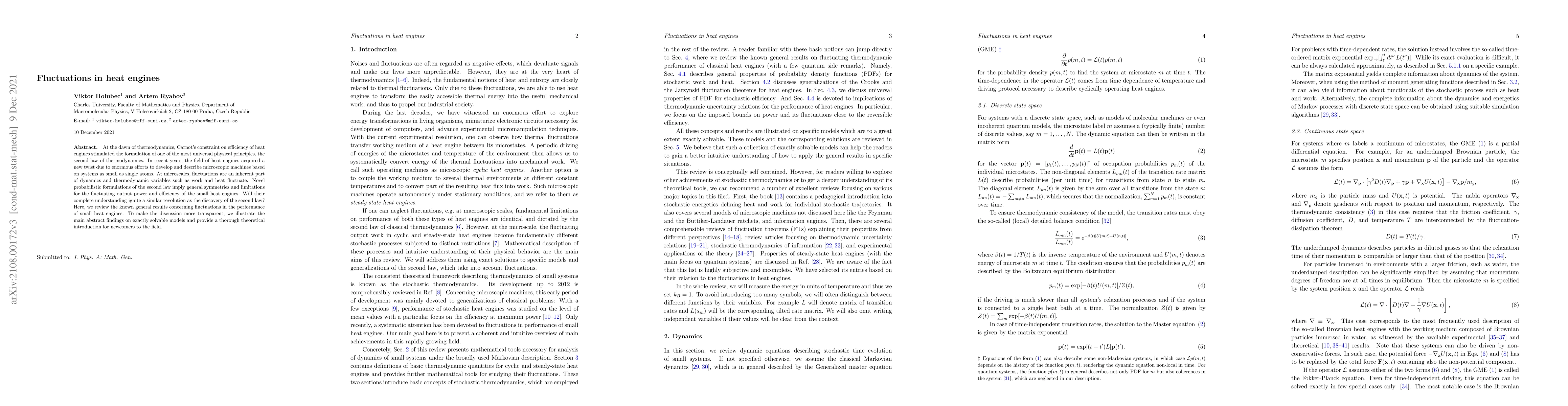 At the dawn of thermodynamics, Carnot's constraint on efficiency of heat engines stimulated the formulation of one of the most universal physical principles, the second law of thermodynamics. In recent years, the field of heat engines acquired a new twist due to enormous efforts to develop and describe microscopic machines based on systems as small as single atoms. At microscales, fluctuations are an inherent part of dynamics and thermodynamic variables such as work and heat fluctuate. Novel probabilistic formulations of the second law imply general symmetries and limitations for the fluctuating output power and efficiency of the small heat engines. Will their complete understanding ignite a similar revolution as the discovery of the second law? Here, we review the known general results concerning fluctuations in the performance of small heat engines. To make the discussion more transparent, we illustrate the main abstract findings on exactly solvable models and provide a thorough theoretical introduction for newcomers to the field.