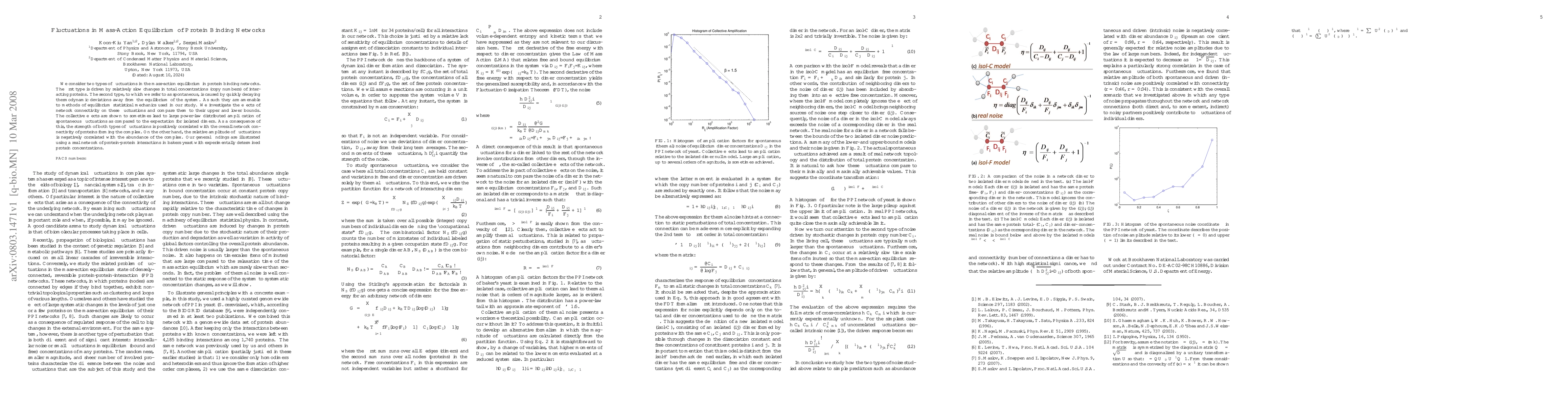 We consider two types of fluctuations in the mass-action equilibrium in protein binding networks. The first type is driven by relatively slow changes in total concentrations (copy numbers) of interacting proteins. The second type, to which we refer to as spontaneous, is caused by quickly decaying thermodynamic deviations away from the equilibrium of the system. As such they are amenable to methods of equilibrium statistical mechanics used in our study. We investigate the effects of network connectivity on these fluctuations and compare them to their upper and lower bounds. The collective effects are shown to sometimes lead to large power-law distributed amplification of spontaneous fluctuations as compared to the expectation for isolated dimers. As a consequence of this, the strength of both types of fluctuations is positively correlated with the overall network connectivity of proteins forming the complex. On the other hand, the relative amplitude of fluctuations is negatively correlated with the abundance of the complex. Our general findings are illustrated using a real network of protein-protein interactions in baker's yeast with experimentally determined protein concentrations.