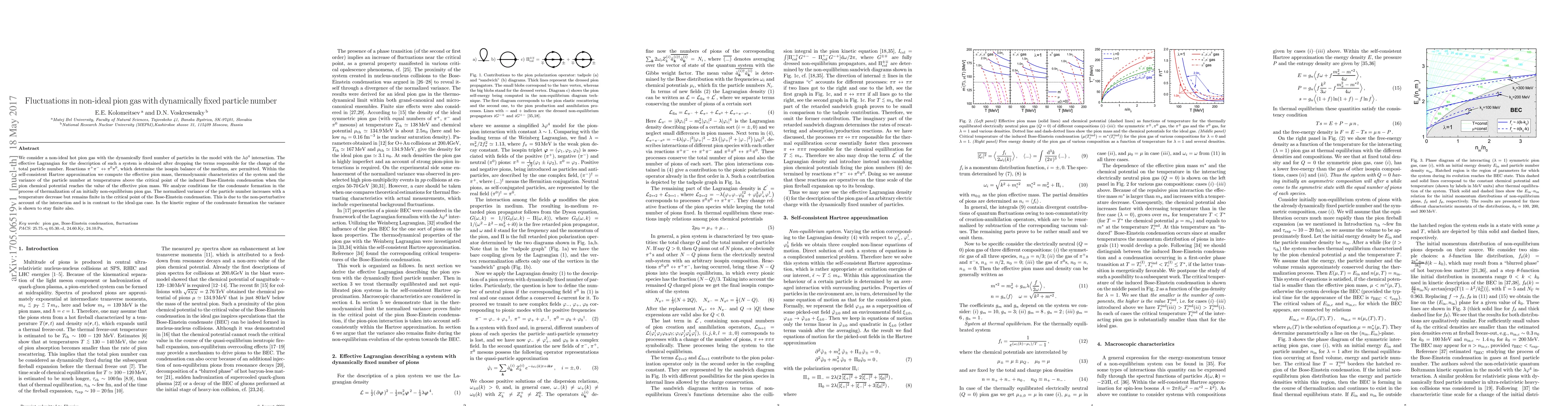 We consider a non-ideal hot pion gas with the dynamically fixed number of particles in the model with the $\lambda\phi^4$ interaction. The effective Lagrangian for the description of such a system is obtained after dropping the terms responsible for the change of the total particle number. Reactions $\pi^+\pi^-\leftrightarrow\pi^0\pi^0$, which determine the isospin balance of the medium, are permitted. Within the self-consistent Hartree approximation we compute the effective pion mass, thermodynamic characteristics of the system and the variance of the particle number at temperatures above the critical point of the induced Bose-Einstein condensation when the pion chemical potential reaches the value of the effective pion mass. We analyze conditions for the condensate formation in the process of thermalization of an initially non-equilibrium pion gas. The normalized variance of the particle number increases with a temperature decrease but remains finite in the critical point of the Bose-Einstein condensation. This is due to the non-perturbative account of the interaction and is in contrast to the ideal-gas case. In the kinetic regime of the condensate formation the variance is shown to stay finite also.