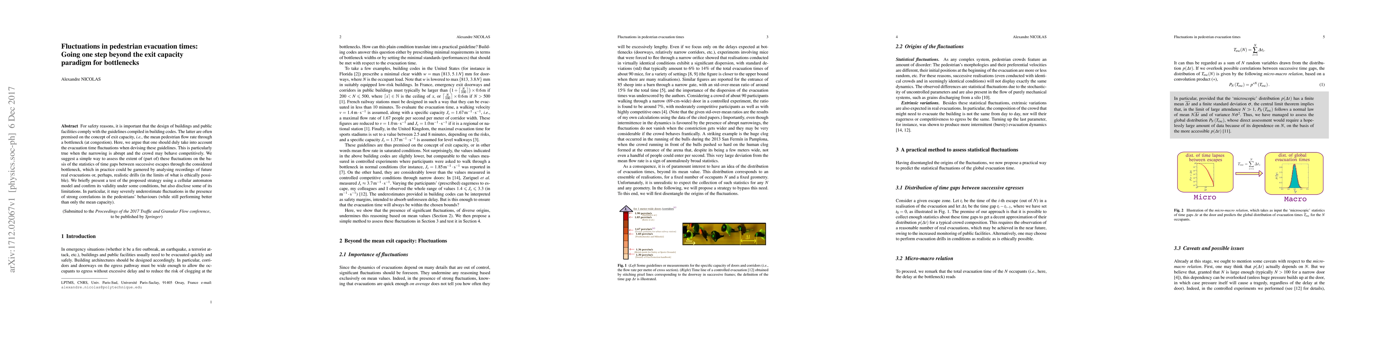 The paper suggests a new approach to designing public facilities by considering fluctuations in pedestrian evacuation times, rather than just mean flow rates, to ensure safety and compliance with building codes. It proposes a simple method to assess these fluctuations using time gap statistics from real or simulated evacuations.