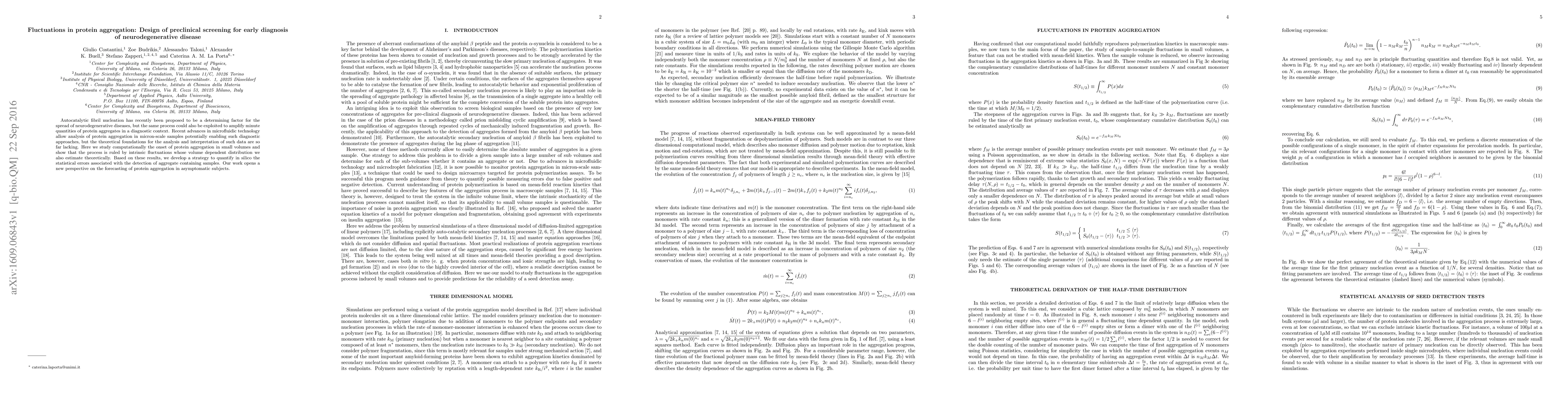 Autocatalytic fibril nucleation has recently been proposed to be a determining factor for the spread of neurodegenerative diseases, but the same process could also be exploited to amplify minute quantities of protein aggregates in a diagnostic context. Recent advances in microfluidic technology allow analysis of protein aggregation in micron-scale samples potentially enabling such diagnostic approaches, but the theoretical foundations for the analysis and interpretation of such data are so far lacking. Here we study computationally the onset of protein aggregation in small volumes and show that the process is ruled by intrinsic fluctuations whose volume dependent distribution we also estimate theoretically. Based on these results, we develop a strategy to quantify in silico the statistical errors associated with the detection of aggregate containing samples. Our work opens a new perspective on the forecasting of protein aggregation in asymptomatic subjects.