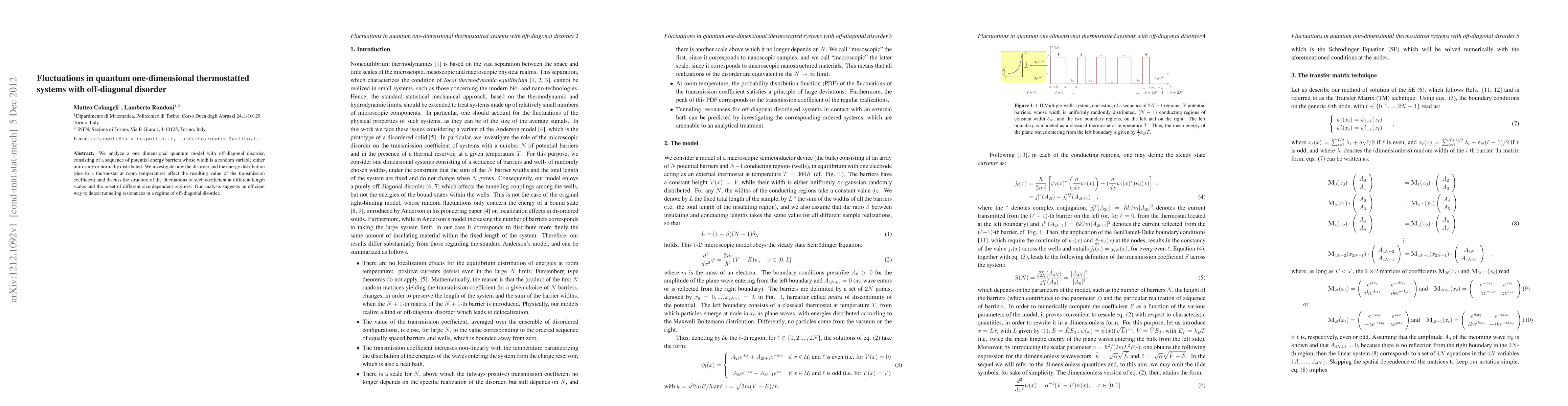 We analyze a one dimensional quantum model with off-diagonal disorder, consisting of a sequence of potential energy barriers whose width is a random variable either uniformly or normally distributed. We investigate how the disorder and the energy distribution (due to a thermostat at room temperature) affect the resulting value of the transmission coefficient, and discuss the structure of the fluctuations of such coefficient at different length scales and the onset of different size-dependent regimes. Our analysis suggests an efficient way to detect tunneling resonances in a regime of off-diagonal disorder.