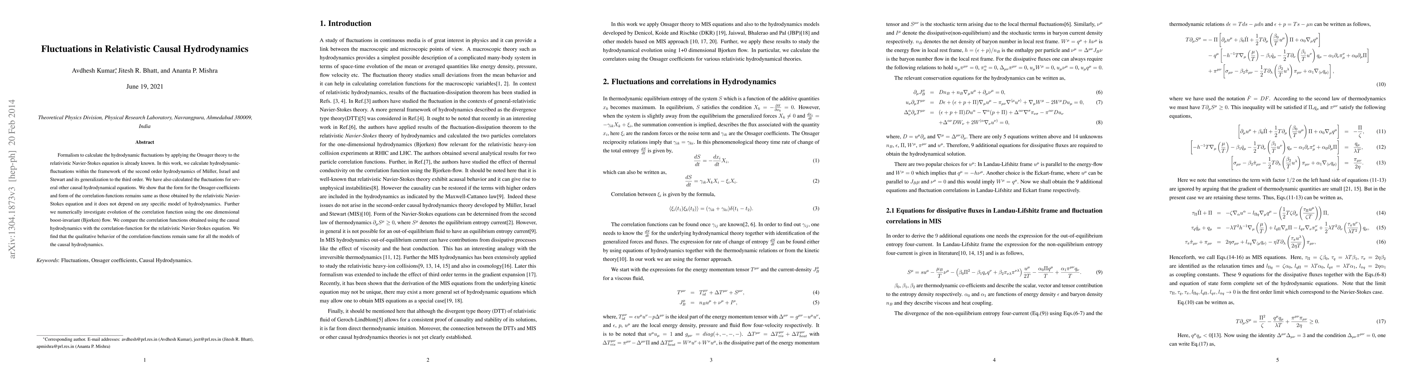 Formalism to calculate the hydrodynamic fluctuations by applying the Onsager theory to the relativistic Navier-Stokes equation is already known. In this work, we calculate hydrodynamic-fluctuations within the framework of the second order hydrodynamics of M\"{u}ller, Israel and Stewart and its generalization to the third order. We have also calculated the fluctuations for several other causal hydrodynamical equations. We show that the form for the Onsager-coefficients and form of the correlation-functions remains same as those obtained by the relativistic Navier-Stokes equation and it does not depend on any specific model of hydrodynamics. Further we numerically investigate evolution of the correlation function using the one dimensional boost-invariant (Bjorken) flow. We compare the correlation functions obtained using the causal hydrodynamics with the correlation-function for the relativistic Navier-Stokes equation. We find that the qualitative behavior of the correlation-functions remain same for all the models of the causal hydrodynamics.
