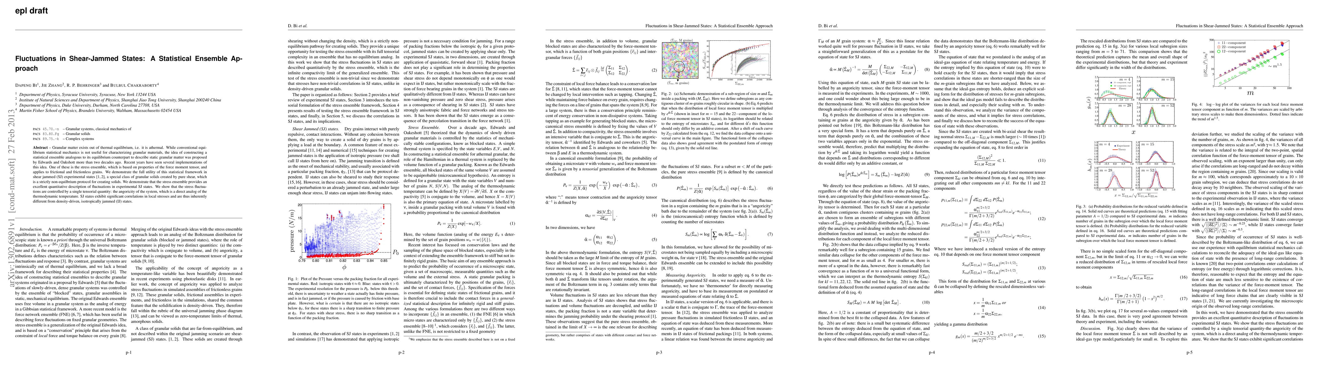 This paper explores the application of a statistical ensemble approach to describe shear-jammed states in granular matter, demonstrating that the stress ensemble provides a quantitative description of fluctuations. It highlights that the stress fluctuations are governed by angoricity, analogous to thermodynamic temperature, and reveals significant correlations in local stresses distinguishing shear-jammed from isotropically jammed states.