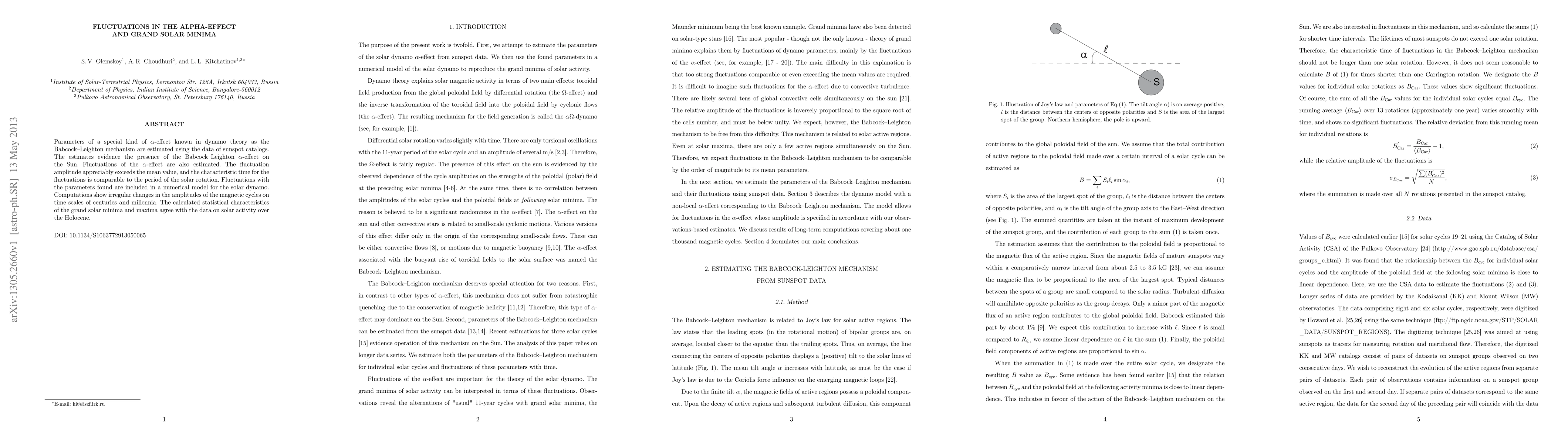 Parameters of a special kind of \alpha-effect known in dynamo theory as the Babcock-Leighton mechanism are estimated using the data of sunspot catalogs. The estimates evidence the presence of the Babcock-Leighton \alpha-effect on the Sun. Fluctuations of the \alpha-effect are also estimated. The fluctuation amplitude appreciably exceeds the mean value, and the characteristic time for the fluctuations is comparable to the period of the solar rotation. Fluctuations with the parameters found are included in a numerical model for the solar dynamo. Computations show irregular changes in the amplitudes of the magnetic cycles on time scales of centuries and millennia. The calculated statistical characteristics of the grand solar minima and maxima agree with the data on solar activity over the Holocene.