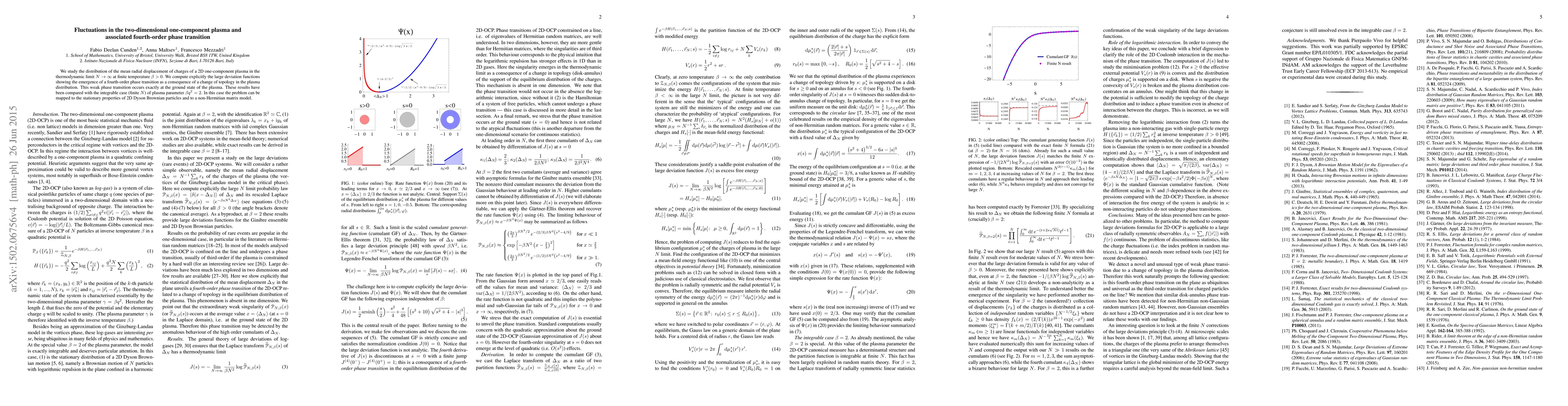 This paper investigates the distribution of mean radial displacement in a two-dimensional one-component plasma, revealing a fourth-order phase transition in the thermodynamic limit. The study identifies this transition as a result of topological changes in the plasma distribution, occurring precisely at the ground state.