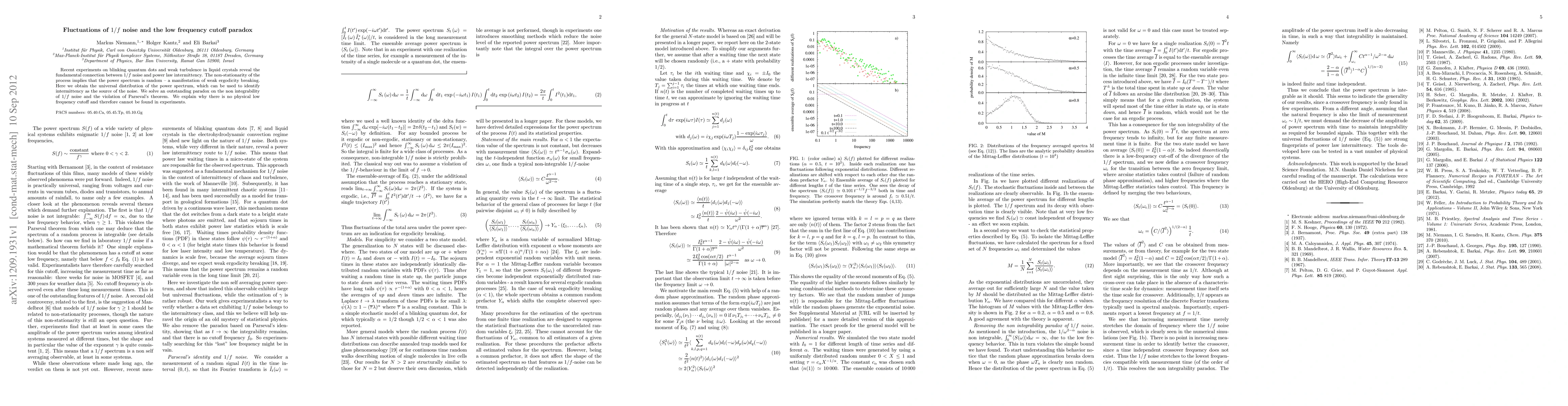 Recent experiments on blinking quantum dots and weak turbulence in liquid crystals reveal the fundamental connection between $1/f$ noise and power law intermittency. The non-stationarity of the process implies that the power spectrum is random -- a manifestation of weak ergodicity breaking. Here we obtain the universal distribution of the power spectrum, which can be used to identify intermittency as the source of the noise. We solve an outstanding paradox on the non integrability of $1/f$ noise and the violation of Parseval's theorem. We explain why there is no physical low frequency cutoff and therefore cannot be found in experiments.