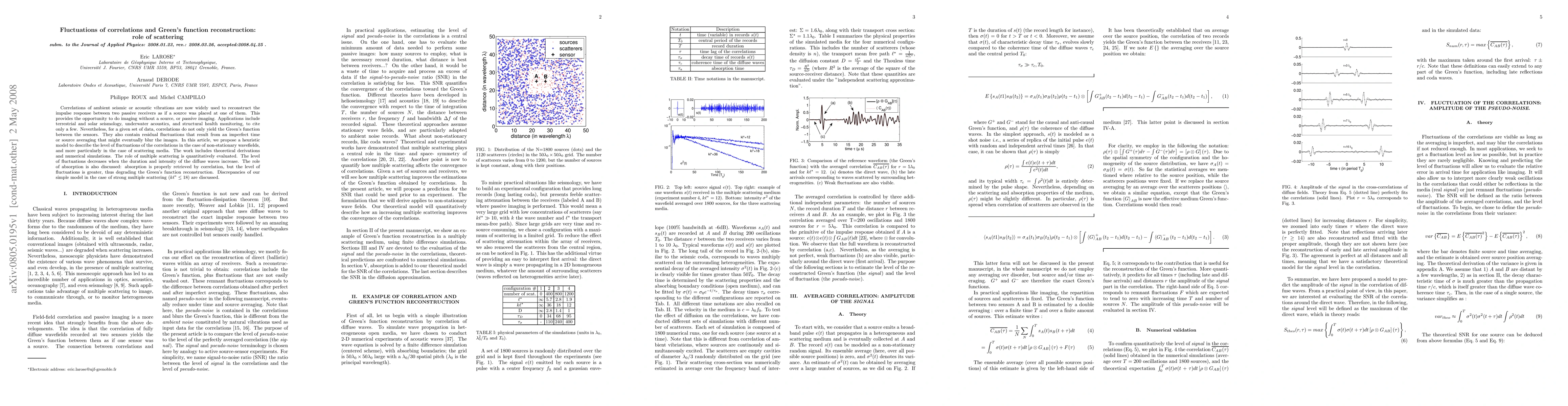 Correlations of ambient seismic or acoustic vibrations are now widely used to reconstruct the impulse response between two passive receivers as if a source was placed at one of them. This provides the opportunity to do imaging without a source, or \textsl{passive imaging}. Applications include terrestrial and solar seismology, underwater acoustics, and structural health monitoring, to cite only a few. Nevertheless, for a given set of data, correlations do not only yield the Green's function between the sensors. They also contain residual fluctuations that result from an imperfect time or source averaging that might eventually blur the images. In this article, we propose a heuristic model to describe the level of fluctuations of the correlations in the case of non-stationary wavefields, and more particularly in the case of scattering media. The work includes theoretical derivations and numerical simulations. The role of multiple scattering is quantitatively evaluated. The level of fluctuations decreases when the duration and intensity of the diffuse waves increase. The role of absorption is also discussed: absorption is properly retrieved by correlation, but the level of fluctuations is greater, thus degrading the Green's function reconstruction. Discrepancies of our simple model in the case of strong multiple scattering ($k\ell^*\leq 18$) are discussed.