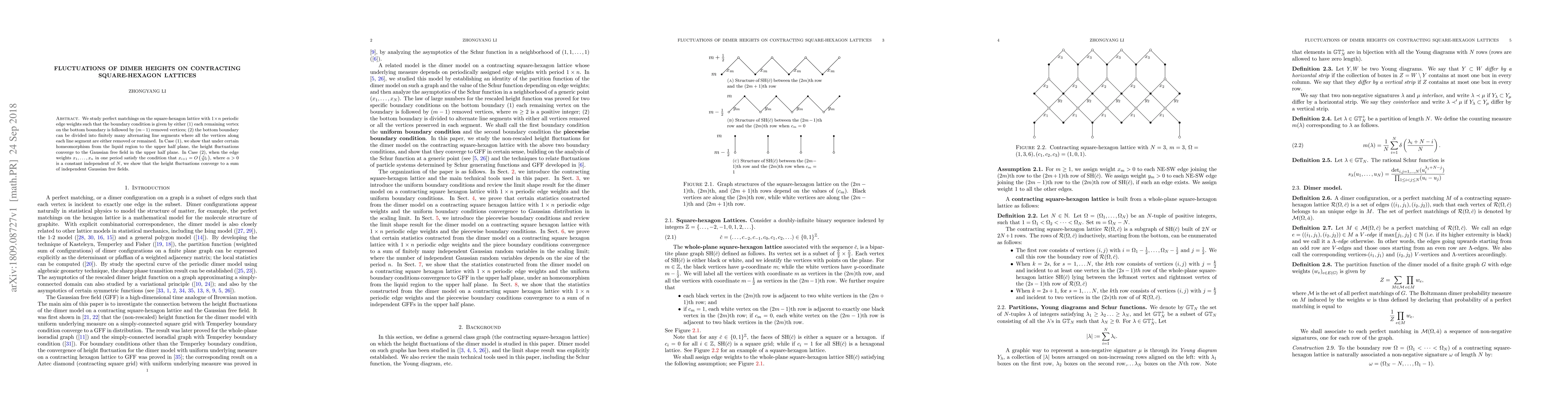We study perfect matchings on the square-hexagon lattice with $1\times n$ periodic edge weights such that the boundary condition is given by either (1) each remaining vertex on the bottom boundary is followed by $(m-1)$ removed vertices; (2) the bottom boundary can be divided into finitely many alternating line segments where all the vertices along each line segment are either removed or remained. In Case (1), we show that under certain homeomorphism from the liquid region to the upper half plane, the height fluctuations converge to the Gaussian free field in the upper half plane. In Case (2), when the edge weights $x_1,\ldots,x_n$ in one period satisfy the condition that $x_{i+1}=O\left(\frac{x_i}{N^{\alpha}}\right)$, where $\alpha>0$ is a constant independent of $N$, we show that the height fluctuations converge to an independent Gaussian free field in each connected component of the liquid region.