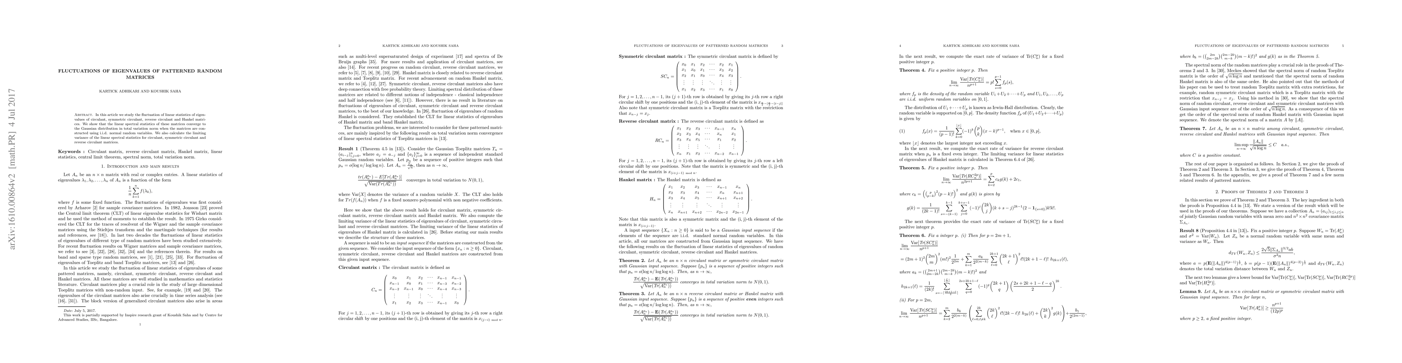 This paper investigates the eigenvalue fluctuations of patterned random matrices, specifically circulant, symmetric circulant, reverse circulant, and Hankel matrices, showing their linear statistics converge to a Gaussian distribution as the matrix size increases, with calculated limiting variances for the former three types.