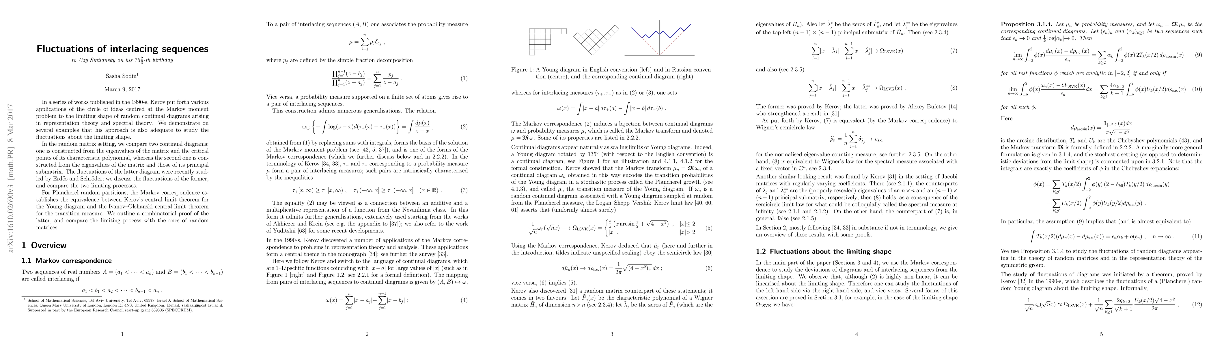 In a series of works published in the 1990-s, Kerov put forth various applications of the circle of ideas centred at the Markov moment problem to the limiting shape of random continual diagrams arising in representation theory and spectral theory. We demonstrate on several examples that his approach is also adequate to study the fluctuations about the limiting shape. In the random matrix setting, we compare two continual diagrams: one is constructed from the eigenvalues of the matrix and the critical points of its characteristic polynomial, whereas the second one is constructed from the eigenvalues of the matrix and those of its principal submatrix. The fluctuations of the latter diagram were recently studied by Erd\H{o}s and Schr\"oder; we discuss the fluctuations of the former, and compare the two limiting processes. For Plancherel random partitions, the Markov correspondence establishes the equivalence between Kerov's central limit theorem for the Young diagram and the Ivanov--Olshanski central limit theorem for the transition measure. We outline a combinatorial proof of the latter, and compare the limiting process with the ones of random matrices.