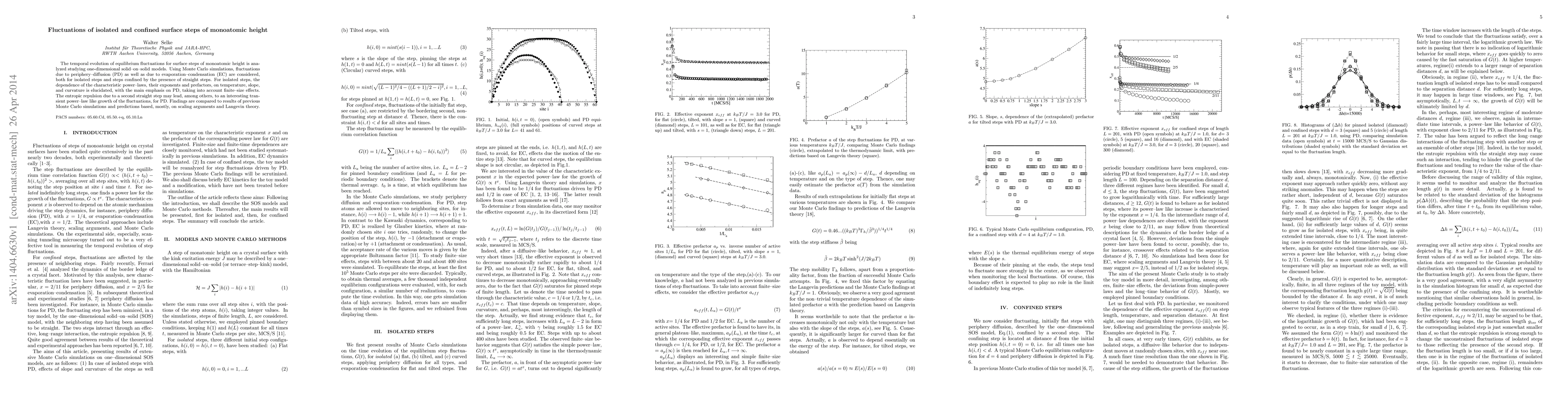This research uses Monte Carlo simulations to study equilibrium fluctuations of monoatomic surface steps in one-dimensional solid-on-solid models, examining periphery-diffusion and evaporation-condensation processes for isolated and confined steps. Key findings include temperature, slope, and curvature dependence of power-law exponents and prefactors for isolated steps, and transient power-law growth of fluctuations due to entropic repulsion from a second straight step. The study compares these results with previous simulations and theoretical predictions.