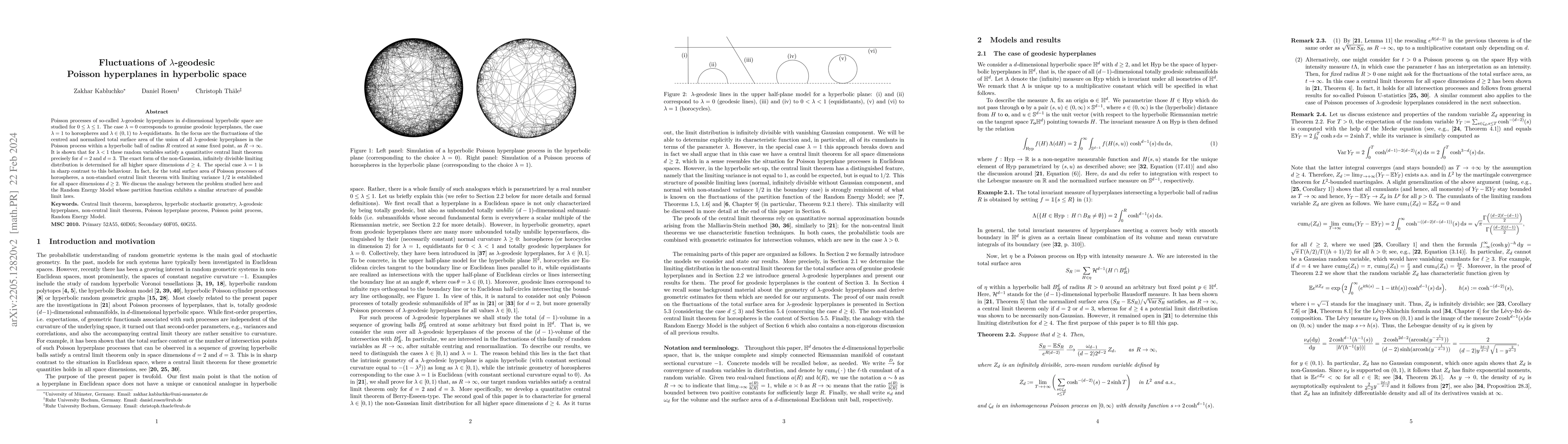 Poisson processes of so-called $\lambda$-geodesic hyperplanes in $d$-dimensional hyperbolic space are studied for $0\leq\lambda\leq 1$. The case $\lambda=0$ corresponds to genuine geodesic hyperplanes, the case $\lambda=1$ to horospheres and $\lambda\in(0,1)$ to $\lambda$-equidistants. In the focus are the fluctuations of the centred and normalized total surface area of the union of all $\lambda$-geodesic hyperplanes in the Poisson process within a hyperbolic ball of radius $R$ centred at some fixed point, as $R\to\infty$. It is shown that for $\lambda<1$ these random variables satisfy a quantitative central limit theorem precisely for $d=2$ and $d=3$. The exact form of the non-Gaussian, infinitely divisible limiting distribution is determined for all higher space dimensions $d\geq 4$. The special case $\lambda=1$ is in sharp contrast to this behaviour. In fact, for the total surface area of Poisson processes of horospheres, a non-standard central limit theorem with limiting variance $1/2$ is established for all space dimensions $d\geq 2$. We discuss the analogy between the problem studied here and the Random Energy Model whose partition function exhibits a similar structure of possible limit laws.