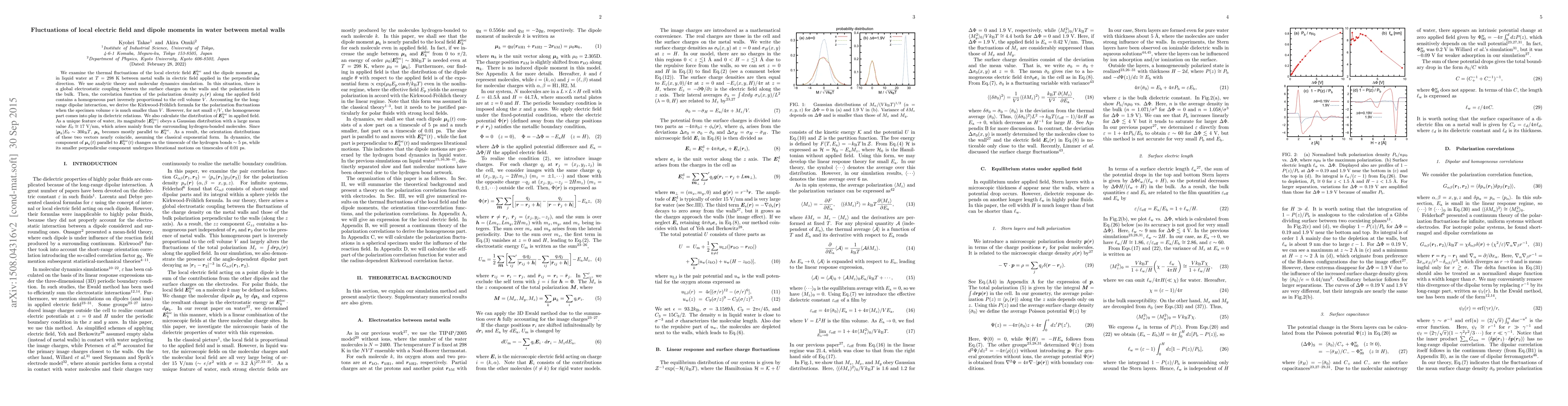 This paper investigates the thermal fluctuations of local electric fields and dipole moments in water confined between metal walls under an applied electric field. It finds that the local electric field magnitude follows a Gaussian distribution due to hydrogen bonding, leading to dipole moments mostly aligned with the local field, with dynamics characterized by hydrogen bond timescales and librational motions.