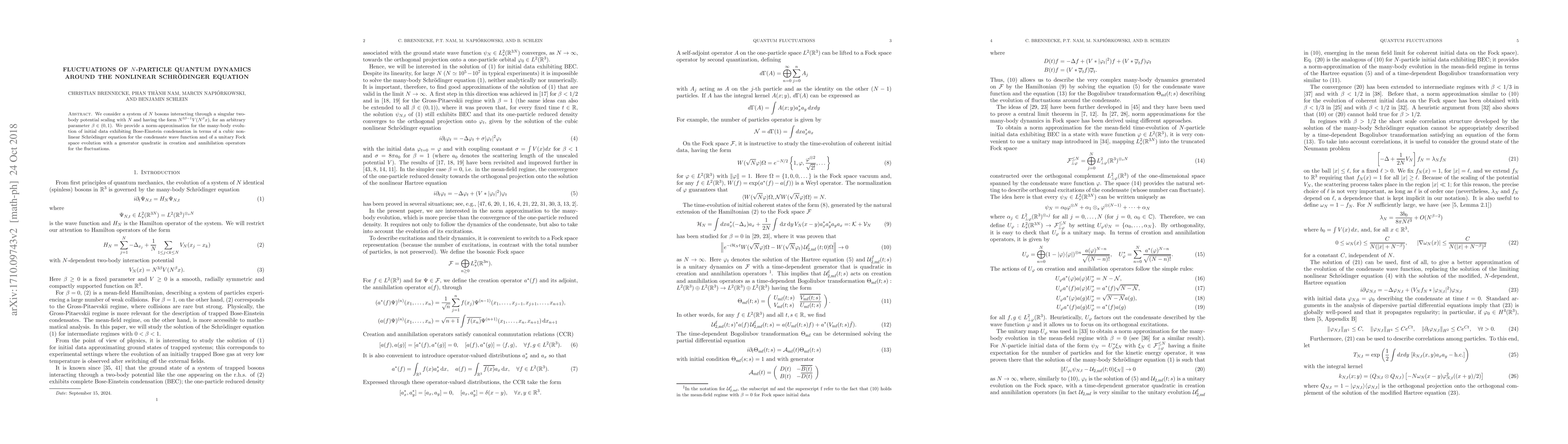 This paper studies the quantum dynamics of $N$ bosons with a singular interaction potential, providing a norm-approximation for their evolution. It connects the many-body system's behavior to a cubic nonlinear Schrödinger equation for the condensate wave function and a unitary evolution for fluctuations.