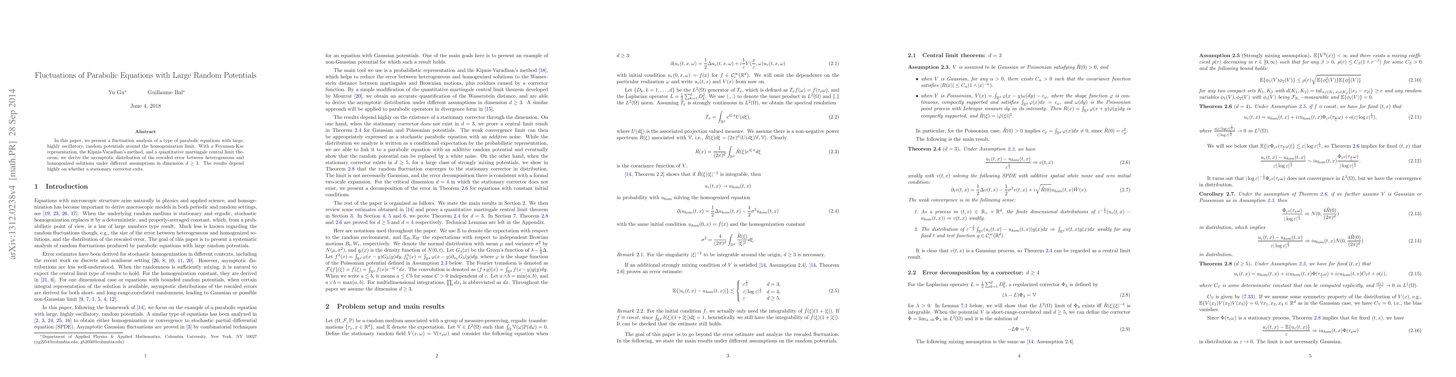 This paper analyzes fluctuations in parabolic equations with large, random potentials near the homogenization limit, deriving the asymptotic distribution of the rescaled error using Feynman-Kac representation and martingale central limit theorems, with results varying based on the existence of a stationary corrector.