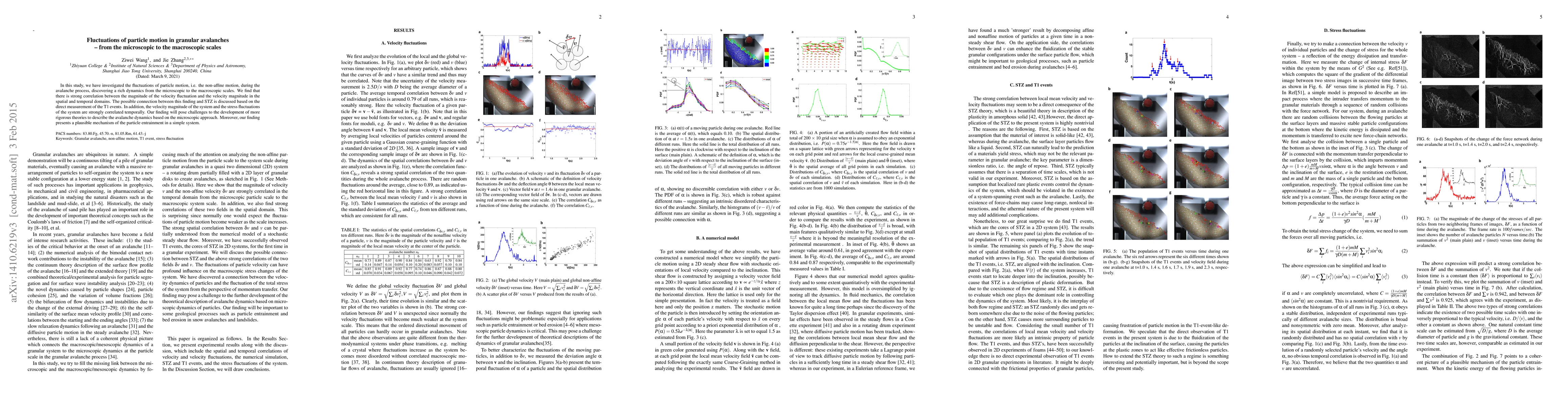 In this study, we have investigated the fluctuations of particle motion, i.e. the non-affine motion, during the avalanche process, discovering a rich dynamics from the microscopic to the macroscopic scales. We find that there is strong correlation between the magnitude of the velocity fluctuation and the velocity magnitude in the spatial and temporal domains. The possible connection between this finding and STZ is discussed based on the direct measurement of the T1 events. In addition, the velocity magnitude of the system and the stress fluctuations of the system are strongly correlated temporally. Our finding will pose challenges to the development of more rigorous theories to describe the avalanche dynamics based on the microscopic approach. Moreover, our finding presents a plausible mechanism of the particle entrainment in a simple system.