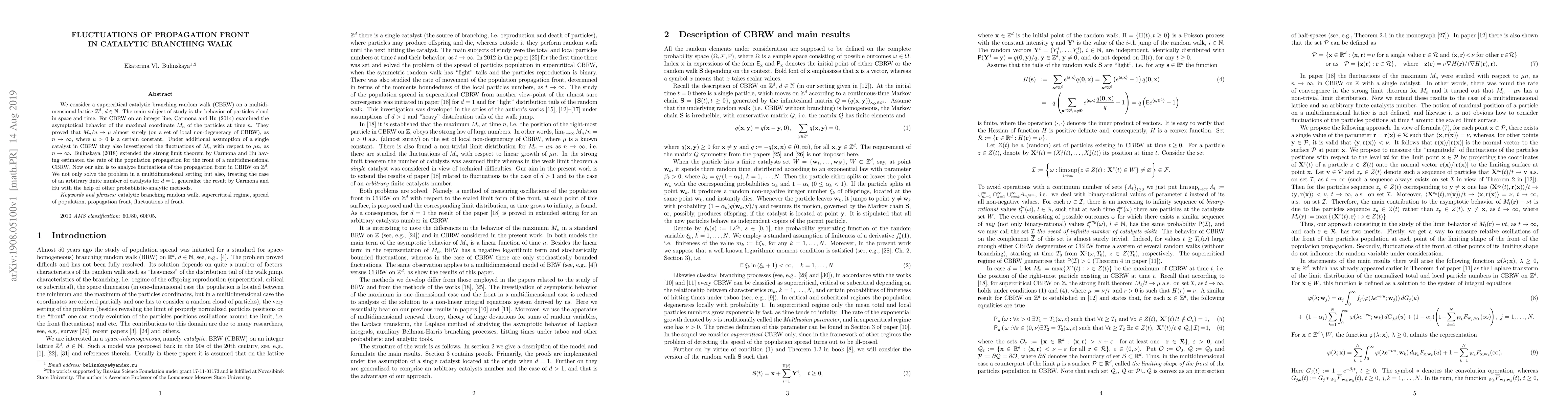 We consider a supercritical catalytic branching random walk (CBRW) on a multidimensional lattice Z^d (d is positive integer). The main subject of study is the behavior of particles cloud in space and time. For CBRW on an integer line, Carmona and Hu (2014) examined the asymptotical behavior of the maximal coordinate M_n of the particles at time n. They proved that M_n/n converges to \mu almost surely (on a set of local non-degeneracy of CBRW), as n tends to infinity, where \mu>0 is a certain constant. Under additional assumption of a single catalyst in CBRW they also investigated the fluctuations of M_n with respect to \mu n, as n grows to infinity. Bulinskaya (2018) extended the strong limit theorem by Carmona and Hu having estimated the rate of the population propagation for the front of a multidimensional CBRW. Now our aim is to analyze fluctuations of the propagation front in CBRW on Z^d. We not only solve the problem in a multidimensional setting but also, treating the case of an arbitrary finite number of catalysts for d = 1, generalize the result by Carmona and Hu with the help of other probabilistic-analytic methods. Keywords and phrases: catalytic branching random walk, supercritical regime, spread of population, propagation front, fluctuations of front.