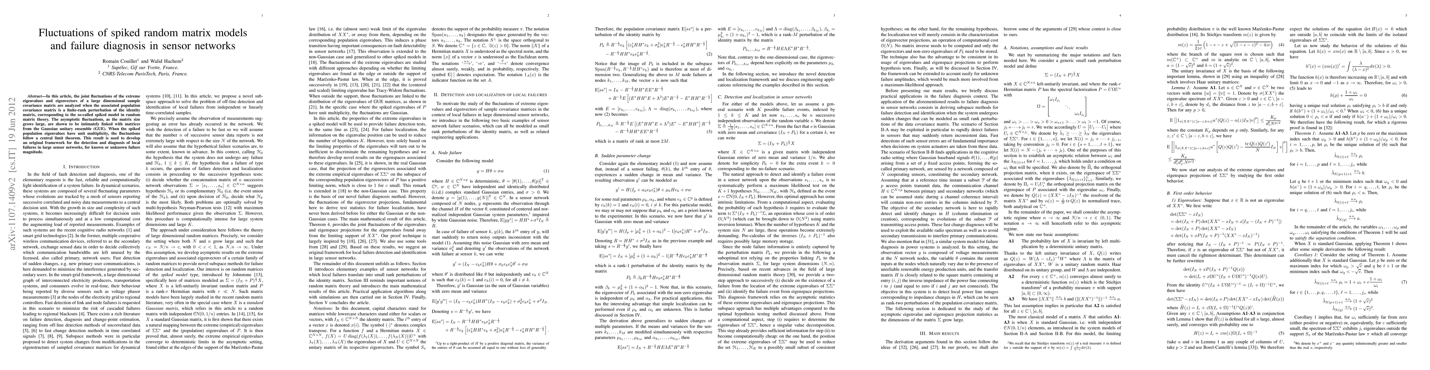 This paper analyzes fluctuations in a type of random matrix model to develop a framework for detecting and diagnosing failures in large sensor networks. It finds that these fluctuations are linked to matrices from the Gaussian unitary ensemble.