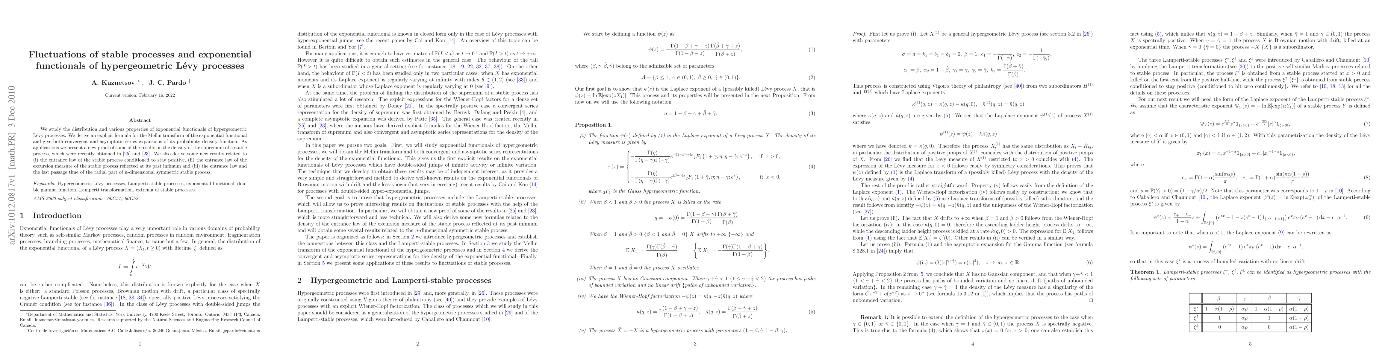 This paper investigates the distribution and properties of exponential functionals of hypergeometric Lévy processes, deriving an explicit formula for their Mellin transform and probability density function expansions. It also provides new proofs and results on the supremum density of stable processes and related entrance laws.