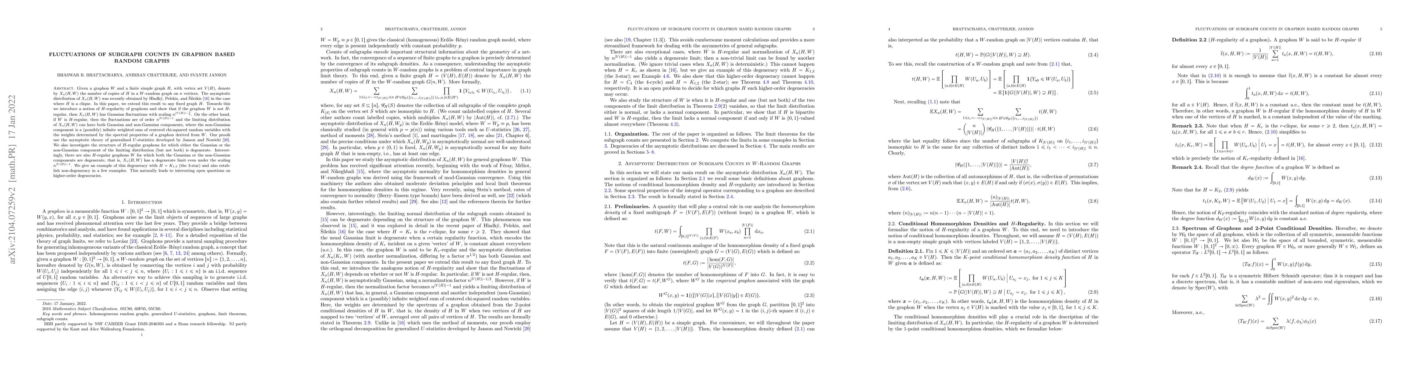 Researchers found that in graphon-based random graphs, the number of copies of a fixed graph H has Gaussian fluctuations with certain scaling factors depending on the graphon's regularity, or non-Gaussian components including chi-squared variables.