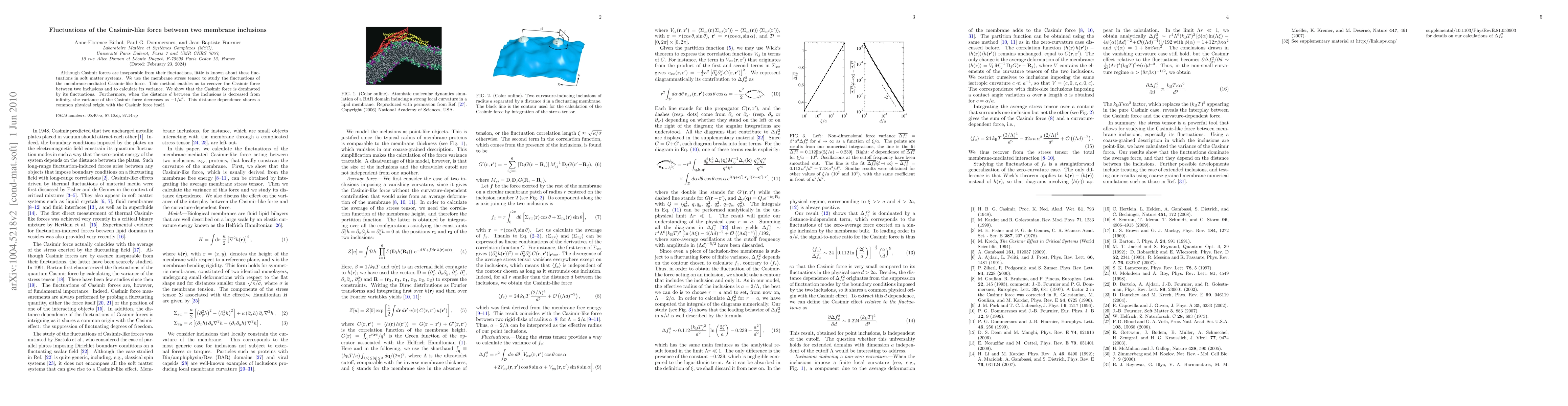 This paper investigates the fluctuations of the Casimir-like force between two membrane inclusions using the membrane stress tensor, revealing that the force is significantly dominated by its fluctuations. The variance of the Casimir force decreases as -1/d^2 with decreasing distance, mirroring the behavior of the Casimir force itself.