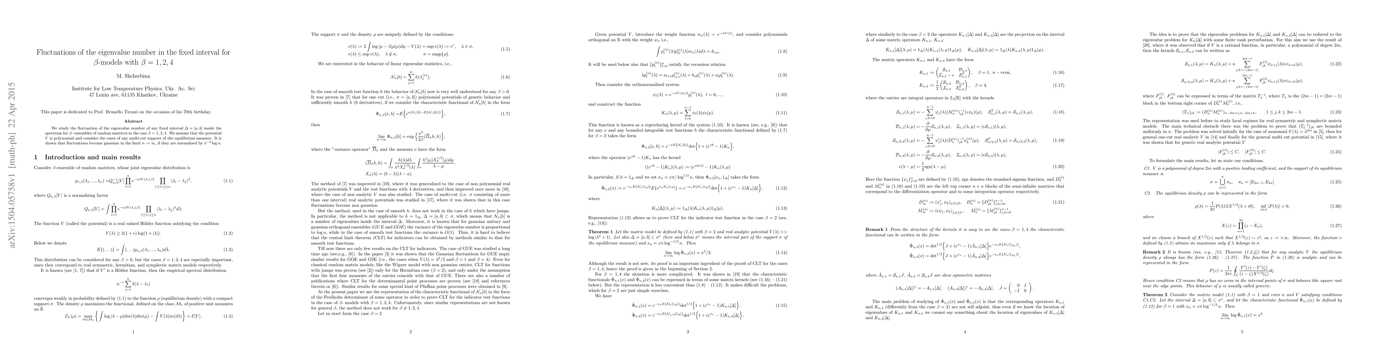 We study the fluctuation of the eigenvalue number of any fixed interval $\Delta=[a,b]$ inside the spectrum for $\beta$- ensembles of random matrices in the case $\beta=1,2,4$. We assume that the potential $V$ is polynomial and consider the cases of any multi-cut support of the equilibrium measure. It is shown that fluctuations become gaussian in the limit $n\to\infty$, if they are normalized by $\pi^{-2}\log n$.