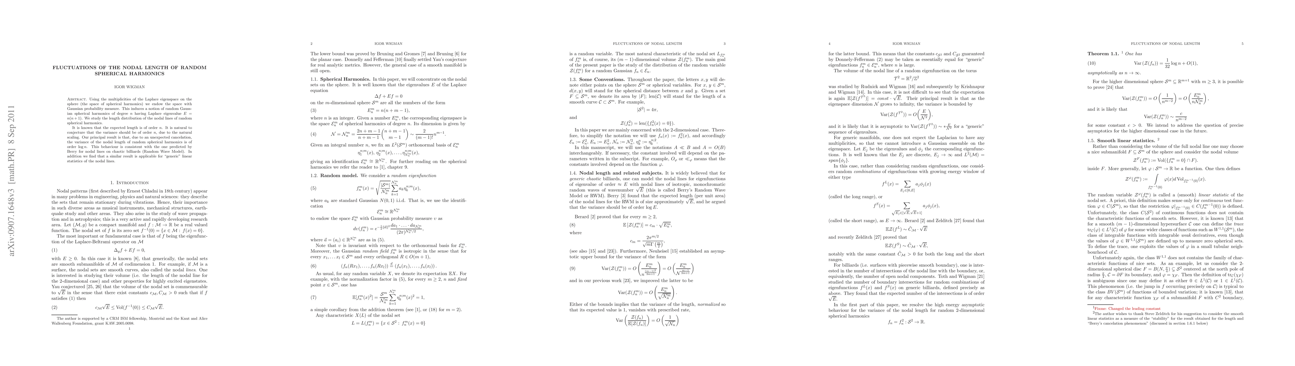 This paper investigates the fluctuations in the nodal length of random spherical harmonics, revealing that contrary to the expected variance of order $n$, the variance is surprisingly of order $\log{n}$. This unexpected result aligns with predictions from the Random Wave Model for chaotic billiards.