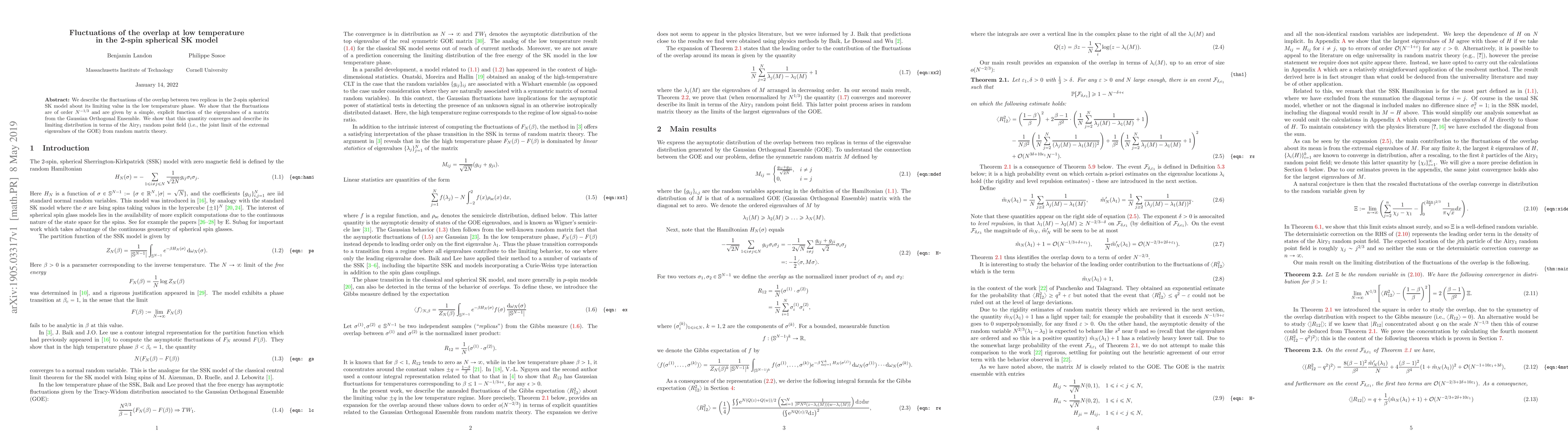 This paper examines fluctuations of the overlap between two replicas in the 2-spin spherical SK model at low temperatures, finding them to be of order $N^{-1/3}$ and described by a simple function of GOE eigenvalues. The study reveals the limiting distribution of this quantity in terms of the Airy1 random point field from random matrix theory.