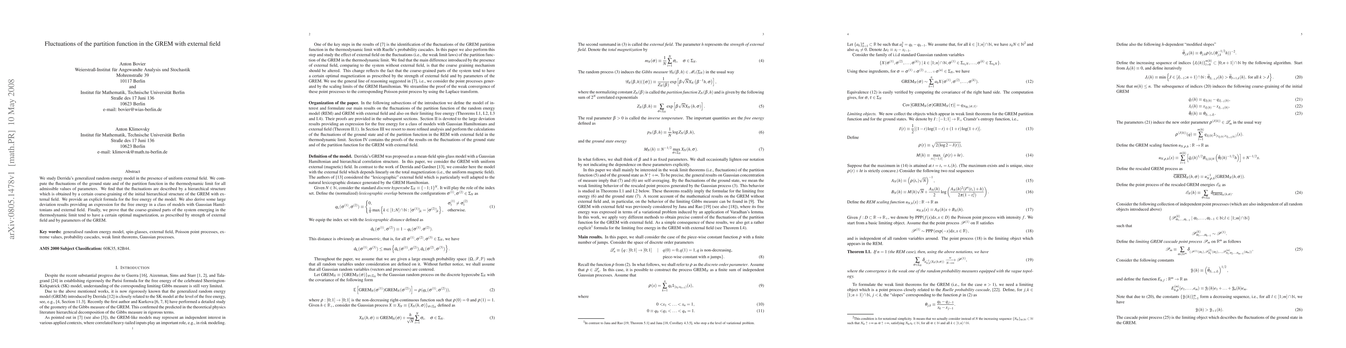 We study Derrida's generalized random energy model in the presence of uniform external field. We compute the fluctuations of the ground state and of the partition function in the thermodynamic limit for all admissible values of parameters. We find that the fluctuations are described by a hierarchical structure which is obtained by a certain coarse-graining of the initial hierarchical structure of the GREM with external field. We provide an explicit formula for the free energy of the model. We also derive some large deviation results providing an expression for the free energy in a class of models with Gaussian Hamiltonians and external field. Finally, we prove that the coarse-grained parts of the system emerging in the thermodynamic limit tend to have a certain optimal magnetization, as prescribed by strength of external field and by parameters of the GREM.