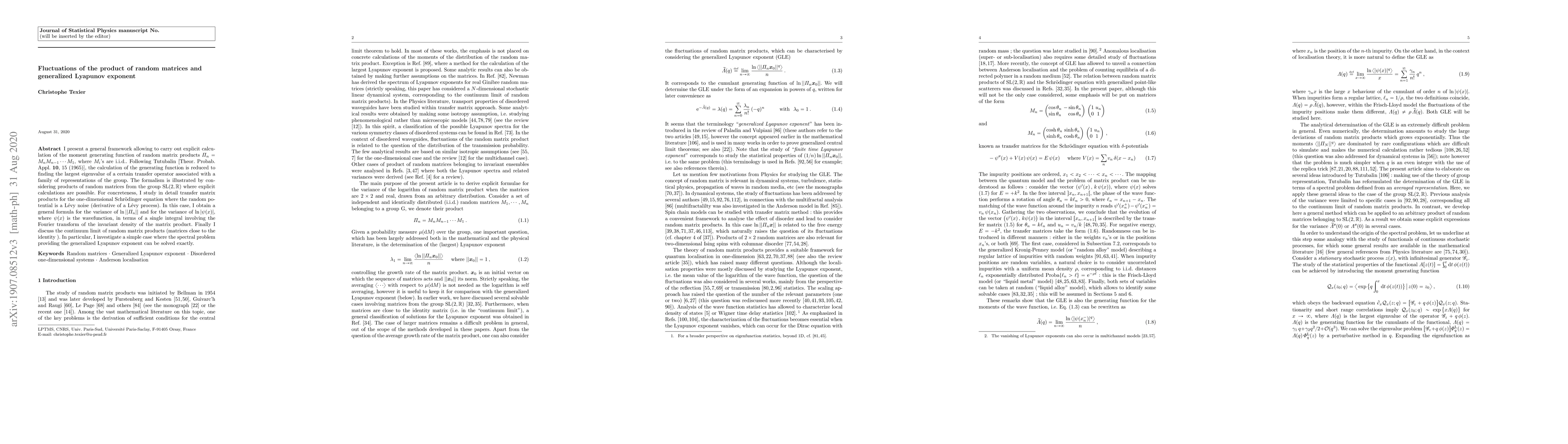 This paper develops a framework for calculating the moment generating function of products of independent and identically distributed random matrices, reducing the problem to finding the largest eigenvalue of a transfer operator. It applies this formalism to random matrices from the group $\mathrm{SL}(2,\mathbb{R})$ and derives expressions for the variance of the logarithm of matrix product norms and wavefunctions in terms of integrals involving the Fourier transform of the invariant density.