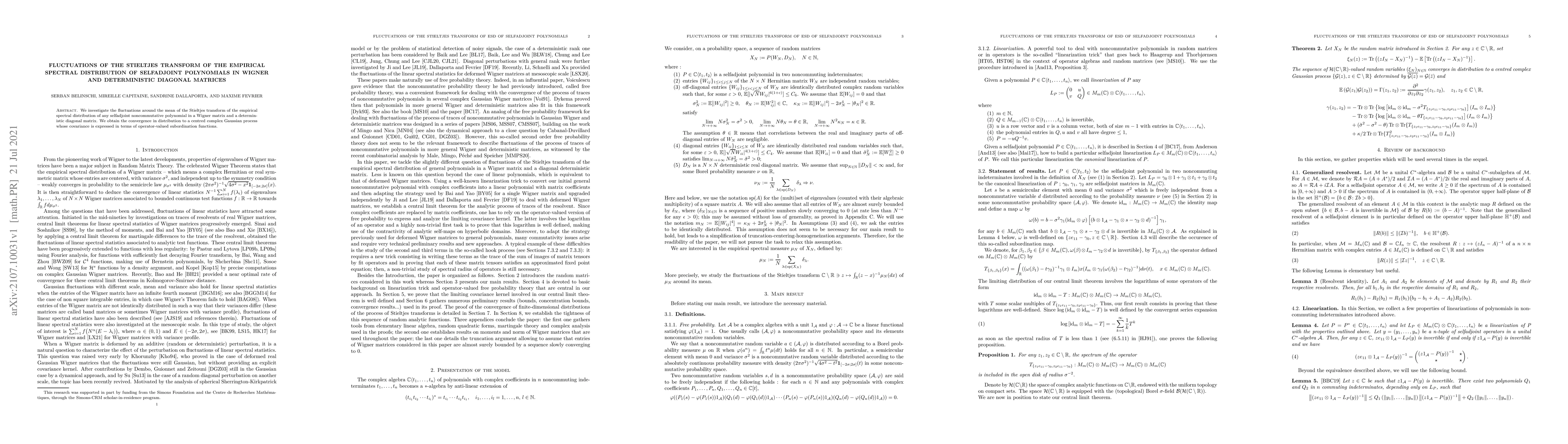 This paper studies the fluctuations of the Stieltjes transform of the empirical spectral distribution of selfadjoint noncommutative polynomials in Wigner and deterministic diagonal matrices. It finds convergence in distribution to a centered complex Gaussian process, with covariance expressed via operator-valued subordination functions.