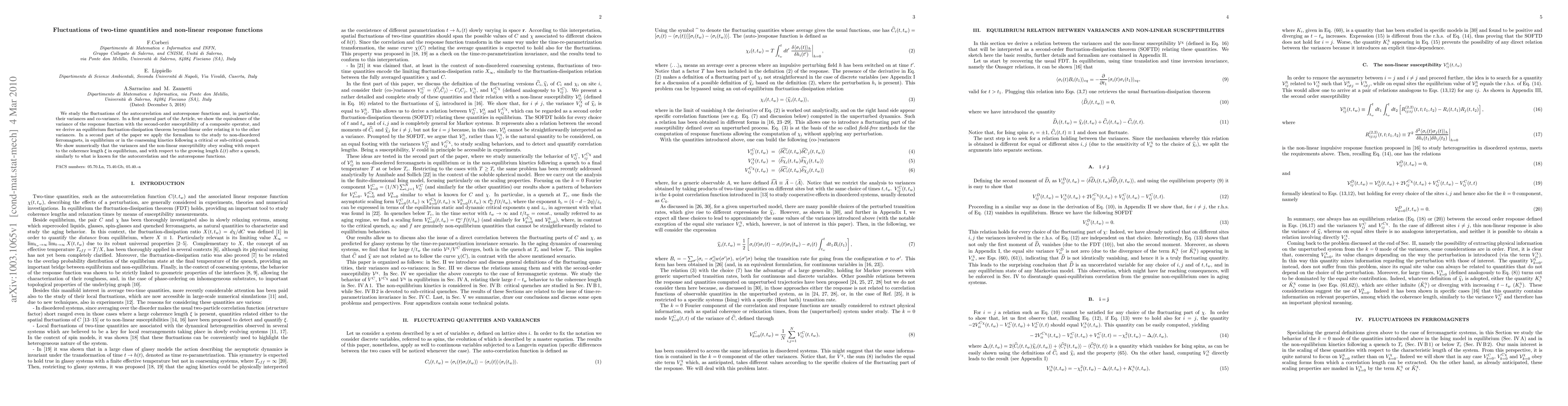 We study the fluctuations of the autocorrelation and autoresponse functions and, in particular, their variances and co-variance. In a first general part of the Article, we show the equivalence of the variance of the response function with the second-order susceptibility of a composite operator, and we derive an equilibrium fluctuation-dissipation theorem beyond-linear order relating it to the other variances. In a second part of the paper we apply the formalism to the study to non-disordered ferromagnets, in equilibrium or in the coarsening kinetics following a critical or sub-critical quench. We show numerically that the variances and the non-linear susceptibility obey scaling with respect to the coherence length $\xi$ in equilibrium, and with respect to the growing length $L(t)$ after a quench, similarly to what is known for the autocorrelation and the autoresponse functions.