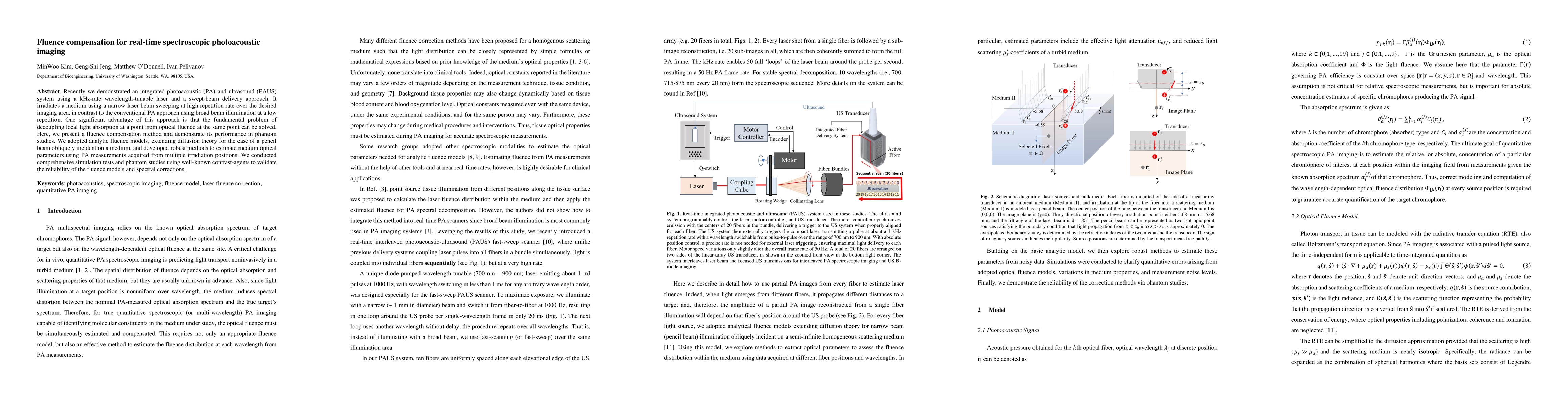 Recently we demonstrated an integrated photoacoustic (PA) and ultrasound (PAUS) system using a kHz-rate wavelength-tunable laser and a swept-beam delivery approach. It irradiates a medium using a narrow laser beam sweeping at high repetition rate over the desired imaging area, in contrast to the conventional PA approach using broad beam illumination at a low repetition. One significant advantage of this approach is that the fundamental problem of decoupling local light absorption at a point from optical fluence at the same point can be solved. Here, we present a fluence compensation method and demonstrate its performance in phantom studies. We adopted analytic fluence models, extending diffusion theory for the case of a pencil beam obliquely incident on a medium, and developed robust methods to estimate medium optical parameters using PA measurements acquired from multiple irradiation positions. We conducted comprehensive simulation tests and phantom studies using well-known contrast-agents to validate the reliability of the fluence models and spectral corrections.