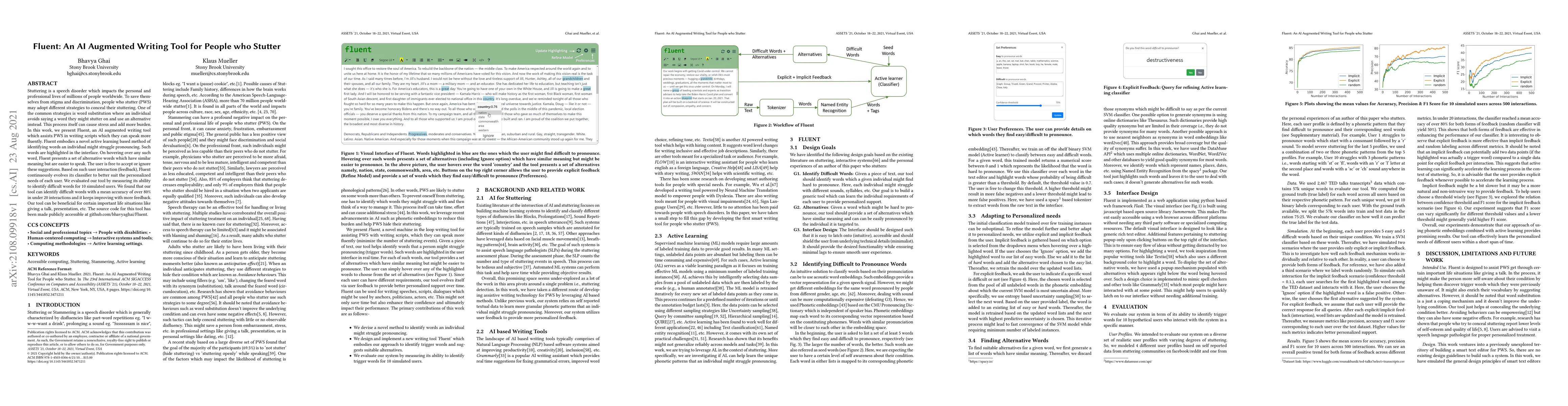 Fluent is an AI-assisted writing tool designed to help people who stutter by suggesting easier-to-pronounce alternatives for difficult words, improving fluency in writing and speaking. The tool uses active learning to refine its suggestions based on user feedback, achieving over 80% accuracy in identifying problematic words after 20 interactions.