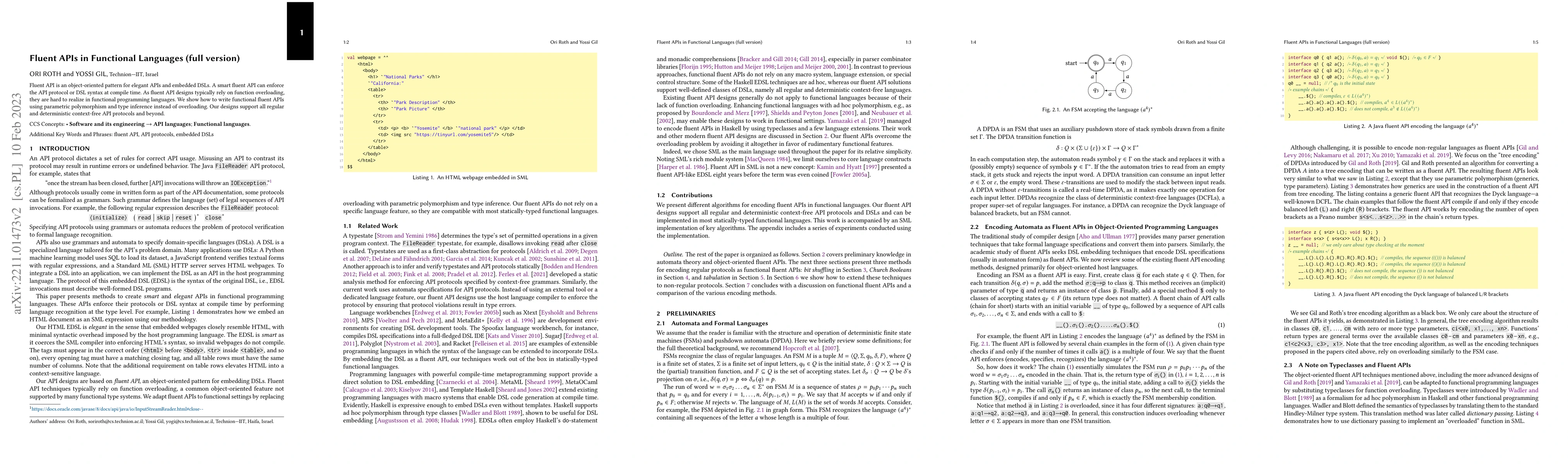 Summary: This paper explores the implementation of fluent APIs in functional programming languages using parametric polymorphism and type inference, enabling the enforcement of API protocols at compile time and supporting a wide range of API protocols.
