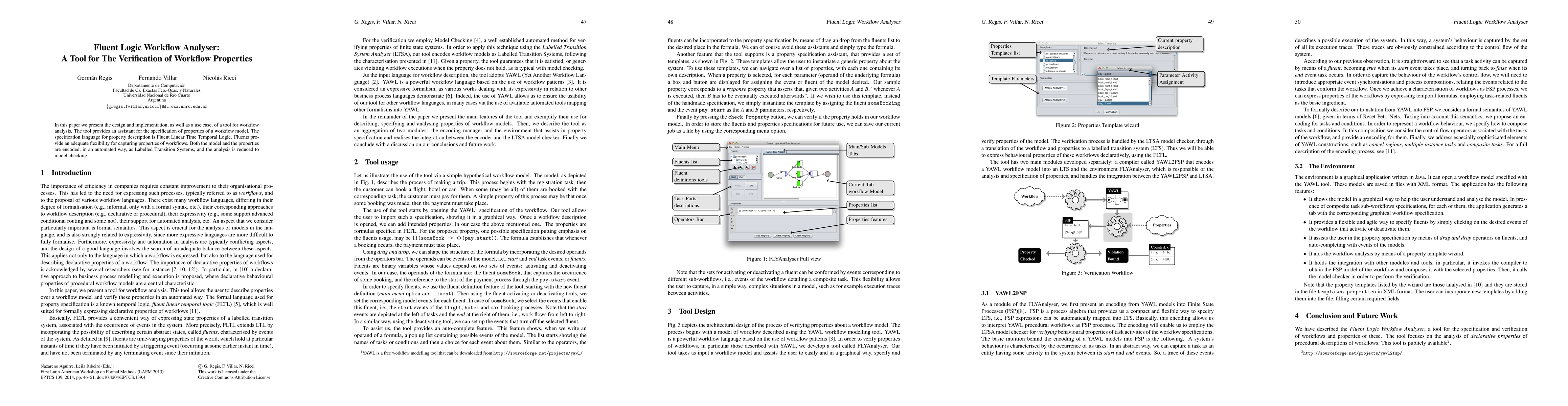This paper introduces Fluent Logic Workflow Analyser, a tool for verifying workflow properties using Fluent Linear Time Temporal Logic. It automates the encoding of workflows and properties as Labelled Transition Systems for model checking.