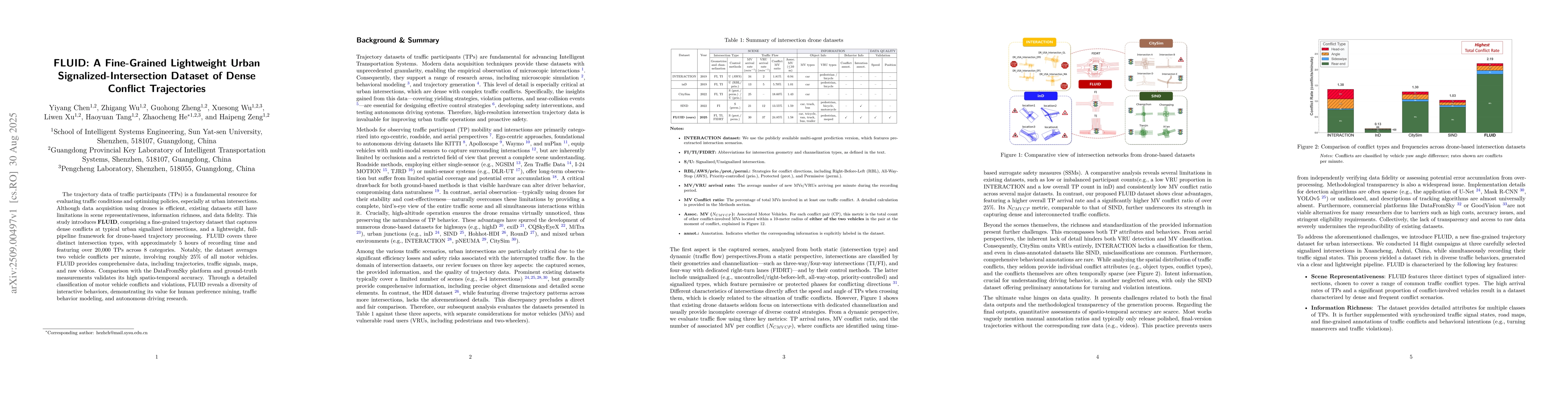 The trajectory data of traffic participants (TPs) is a fundamental resource for evaluating traffic conditions and optimizing policies, especially at urban intersections. Although data acquisition using drones is efficient, existing datasets still have limitations in scene representativeness, information richness, and data fidelity. This study introduces FLUID, comprising a fine-grained trajectory dataset that captures dense conflicts at typical urban signalized intersections, and a lightweight, full-pipeline framework for drone-based trajectory processing. FLUID covers three distinct intersection types, with approximately 5 hours of recording time and featuring over 20,000 TPs across 8 categories. Notably, the dataset averages two vehicle conflicts per minute, involving roughly 25% of all motor vehicles. FLUID provides comprehensive data, including trajectories, traffic signals, maps, and raw videos. Comparison with the DataFromSky platform and ground-truth measurements validates its high spatio-temporal accuracy. Through a detailed classification of motor vehicle conflicts and violations, FLUID reveals a diversity of interactive behaviors, demonstrating its value for human preference mining, traffic behavior modeling, and autonomous driving research.