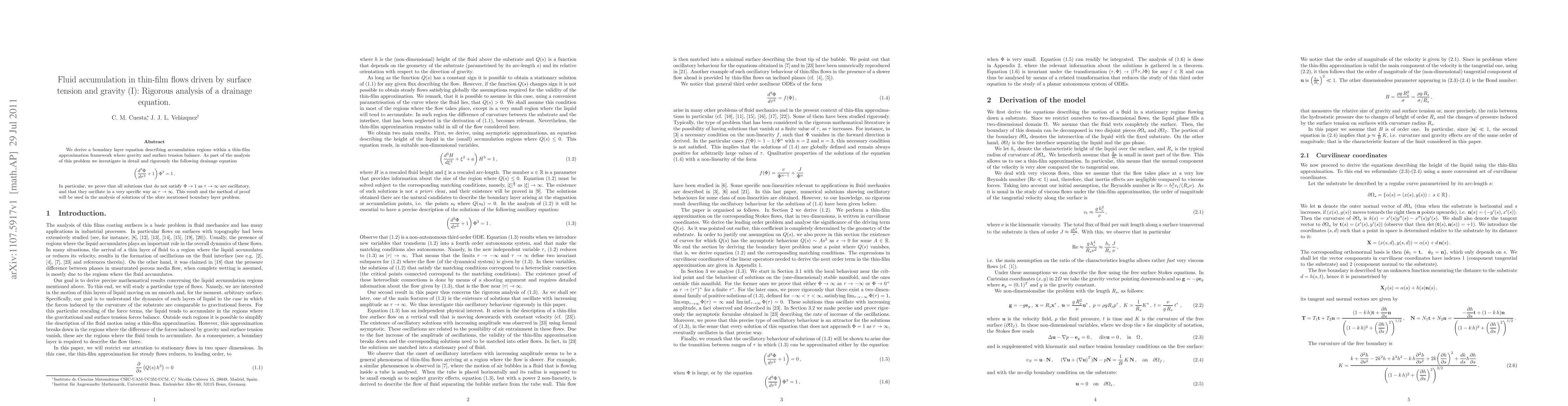 We derive a boundary layer equation describing accumulation regions within a thin-film approximation framework where gravity and surface tension balance. As part of the analysis of this problem we investigate in detail and rigorously the 'drainage' equation (phi"'+1)phi^3=1. In particular, we prove that all solutions that do not tend to 1 as the independent variable goes to infinity are oscillatory, and that they oscillate in a very specific way. This result and the method of proof will be used in the analysis of solutions of the afore mentioned boundary layer problem.
