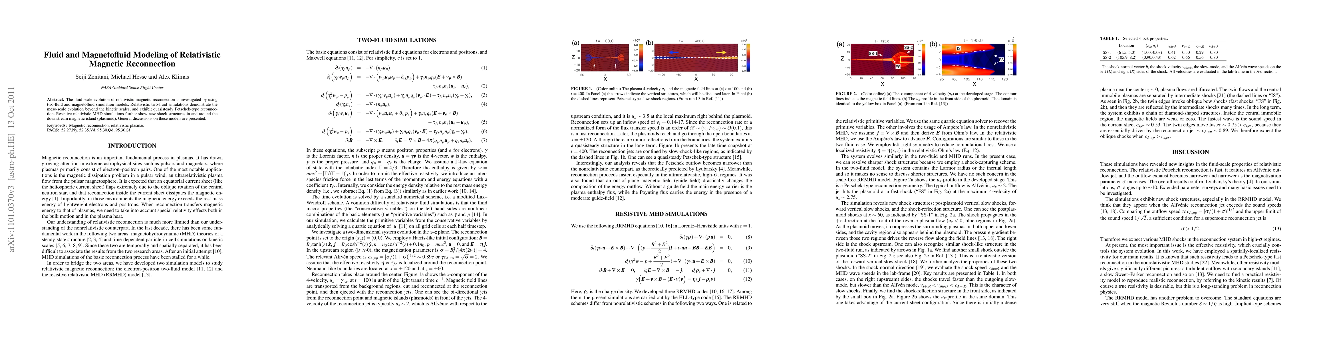This paper investigates relativistic magnetic reconnection using two-fluid and magnetofluid models, revealing meso-scale evolution and quasi-steady reconnection, alongside new shock structures in downstream plasmoids from resistive MHD simulations.