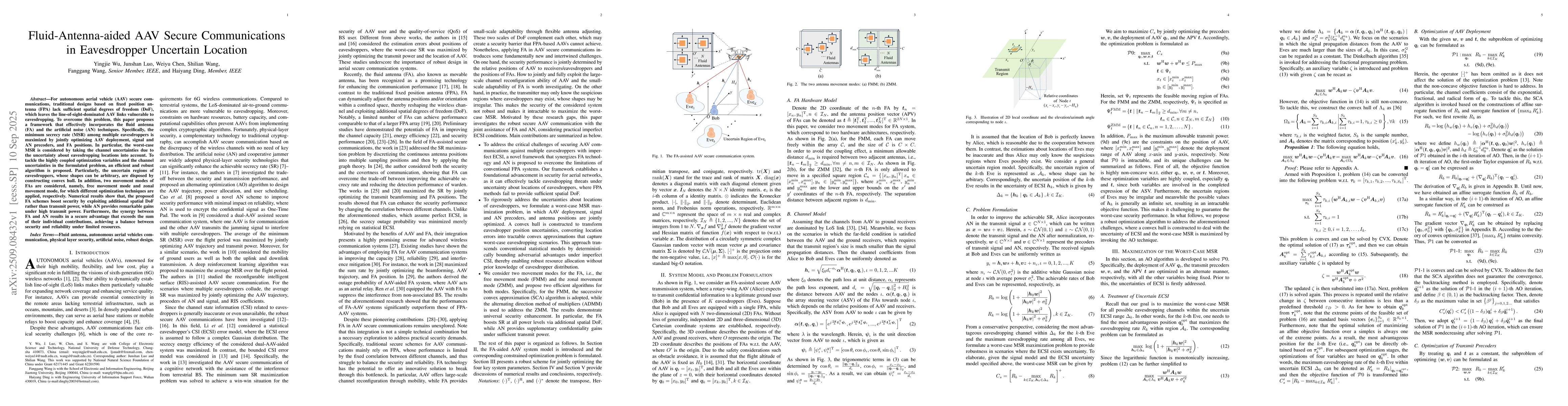 For autonomous aerial vehicle (AAV) secure communications, traditional designs based on fixed position antenna (FPA) lack sufficient spatial degrees of freedom (DoF), which leaves the line-of-sight-dominated AAV links vulnerable to eavesdropping. To overcome this problem, this paper proposes a framework that effectively incorporates the fluid antenna (FA) and the artificial noise (AN) techniques. Specifically, the minimum secrecy rate (MSR) among multiple eavesdroppers is maximized by jointly optimizing AAV deployment, signal and AN precoders, and FA positions. In particular, the worst-case MSR is considered by taking the channel uncertainties due to the uncertainty about eavesdropping locations into account. To tackle the highly coupled optimization variables and the channel uncertainties in the formulated problem, an efficient and robust algorithm is proposed. Particularly, the uncertain regions of eavesdroppers, whose shapes can be arbitrary, are disposed by constructing convex hull. In addition, two movement modes of FAs are considered, namely, free movement mode and zonal movement mode, for which different optimization techniques are applied, respectively. Numerical results show that, the proposed FA schemes boost security by exploiting additional spatial DoF rather than transmit power, while AN provides remarkable gains under high transmit power. Furthermore, the synergy between FA and AN results in a secure advantage that exceeds the sum of their individual contributions, achieving a balance between security and reliability under limited resources.