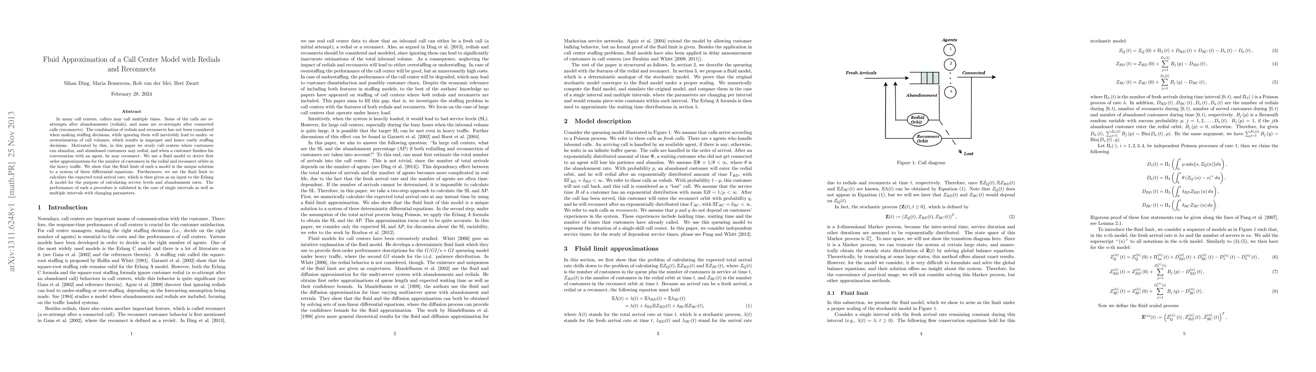 This paper develops a fluid approximation model for call centers considering both redials and reconnects, deriving first-order approximations for customer volumes in heavy traffic. The fluid limit is used to calculate the expected total arrival rate, which informs the Erlang A model for service levels and abandonment rates, validated across single and multiple intervals.