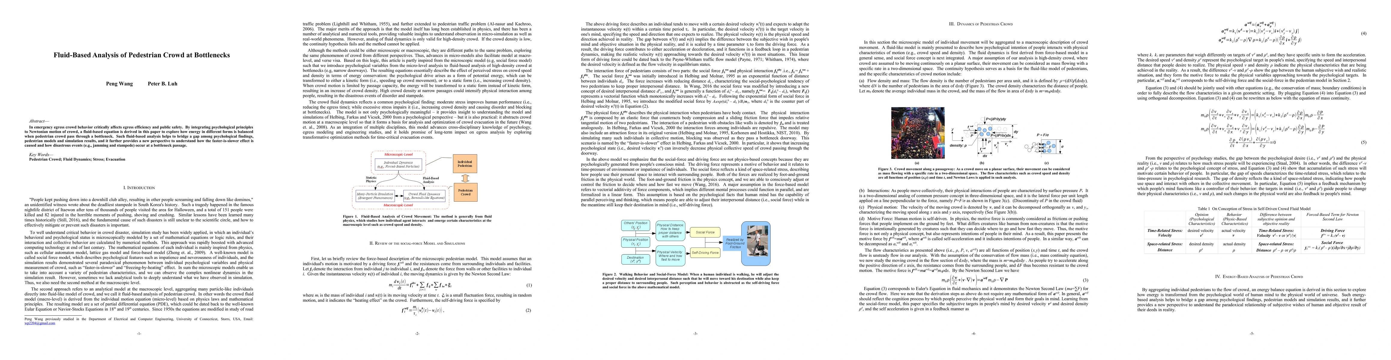 This paper develops a fluid-based equation to analyze pedestrian crowd dynamics at bottlenecks, integrating psychological principles with Newtonian motion to explore energy balance and the "faster-is-slower" effect, aiming to enhance understanding of crowd behavior and prevent disastrous events.