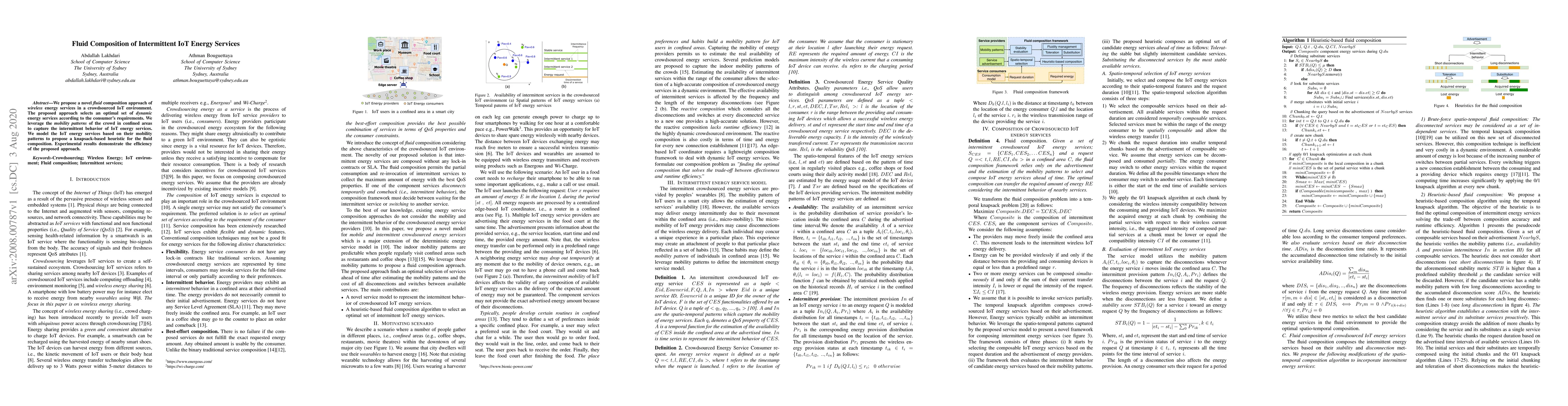 This paper introduces a fluid composition method for wireless energy services in a crowdsourced IoT environment, optimizing the selection of dynamic energy services based on consumer needs and leveraging crowd mobility patterns. The approach models IoT energy services and employs a knapsack-based heuristic, showing effective results in experiments.